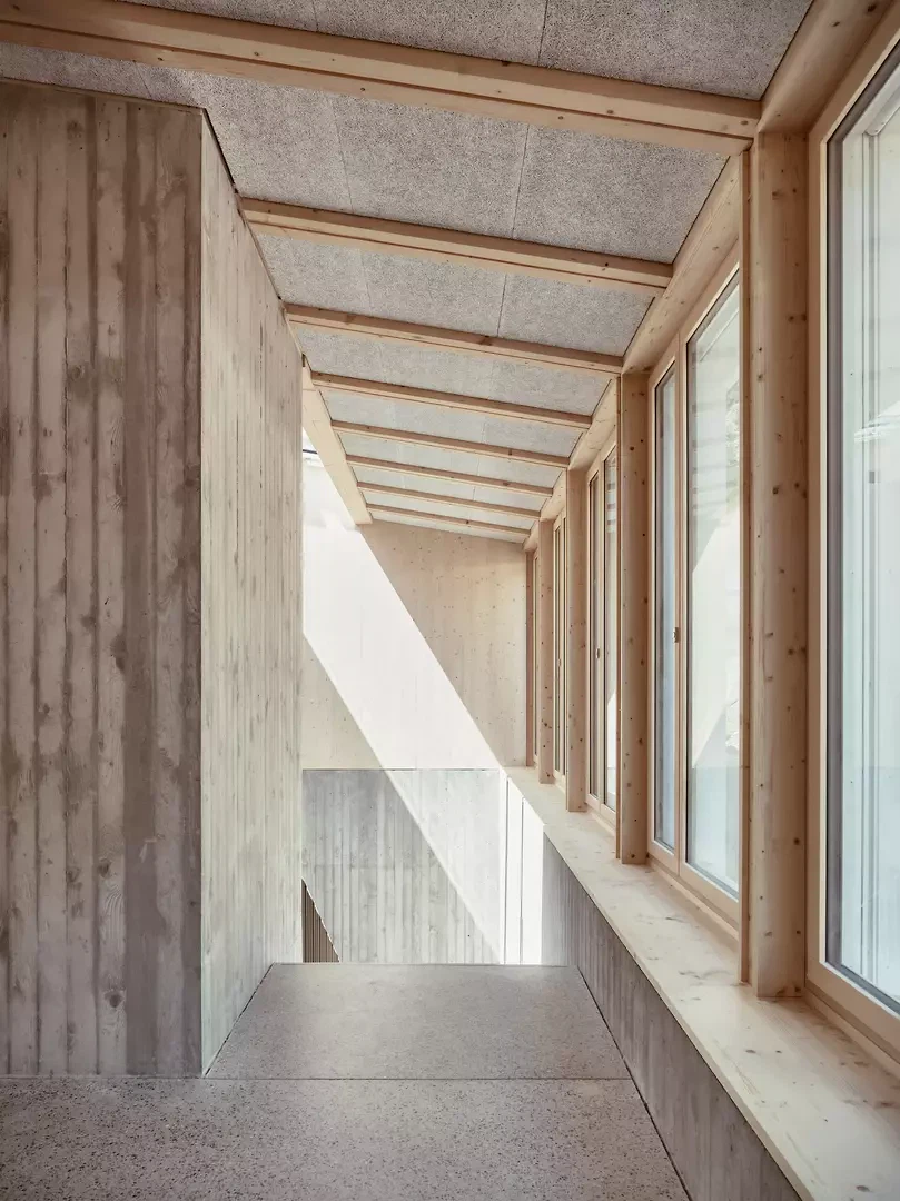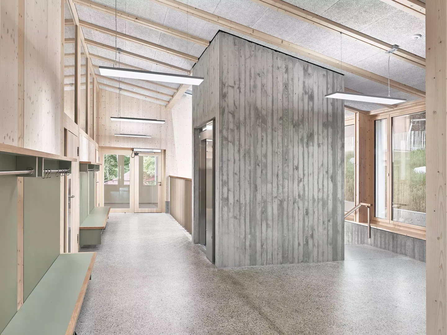 La conception de base, qui repose sur une trame simple, permet de créer un système flexible à l'étage supérieur, où se trouvent les salles de classe. La structure porteuse des étages supérieurs est conçue en bois. Les forces horizontales dues aux séismes et au vent sont transmises au sol par la structure en bois et la semelle massive en béton coulé sur place. Des éléments de plancher en bois statiquement efficaces couvrent les portées des salles de classe avec un entraxe économique. Le mur côté pente, les dalles de sol et de plafond du rez-de-chaussée ainsi que certaines parties des cloisons transversales de l'aile des locaux annexes à l'étage supérieur sont conçus comme une construction massive monolithique. On obtient ainsi une construction durable et nécessitant peu d'entretien pour absorber la pression du talus, qui garantit l'étanchéité et permet de répartir uniformément les charges sur le sol. Une poutre renforcée ancrera en outre le bâtiment contre le talus.