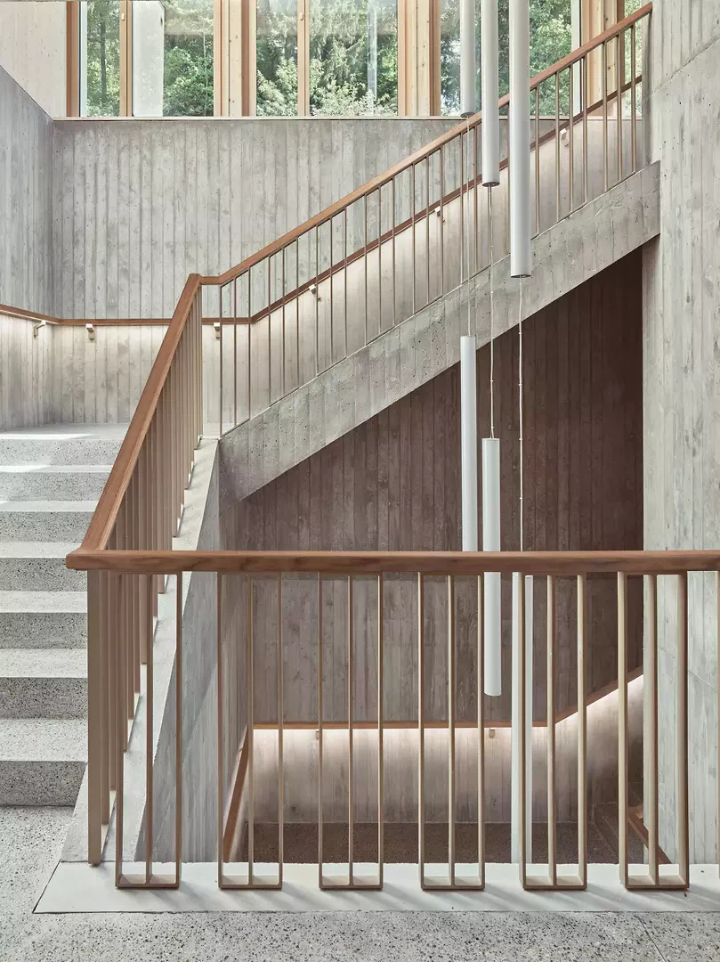 L'un des défis de la conception consistait à concilier l'ensemble du site, façonné par l'histoire et présentant une topographie marquée, avec les exigences d'accessibilité maximale d'une école spécialisée en pédagogie curative et de ses ateliers et salles de classe. Le bâtiment y parvient en offrant à chaque étage une sortie directe de plain-pied, reliant ainsi les différents niveaux des espaces extérieurs. Parallèlement, cette astuce a permis, malgré la présence de trois étages utiles, de se passer d’une issue de secours verticale, c’est-à-dire d’une cage d’escalier de secours, et toutes les zones de circulation ont pu être aménagées en espaces de détente et vestiaires de qualité. Pour le fonctionnement de l’école, il en résulte un bâtiment à usage flexible, avec un lien fort avec l’espace extérieur à chaque étage.
