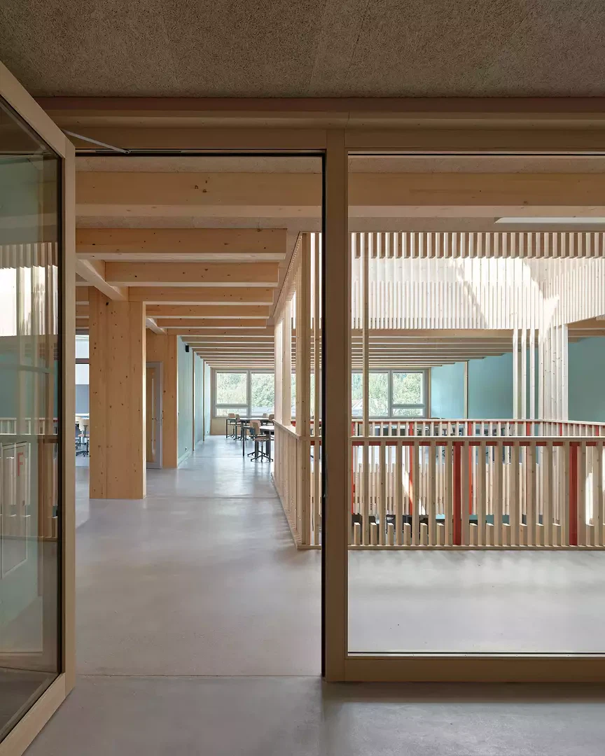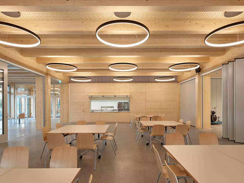 Avec sa toiture en papillon, le nouveau bâtiment établit un lien avec les constructions existantes de l’ensemble scolaire. Deux patios offrent des relations visuelles entre les niveaux. Leurs émergences en toiture structurent le toit et apparaissent notamment la nuit comme des lanternes posées, visibles de loin. Les deux atriums présentent des hauteurs différentes: le premier, au nord, s’élève sur trois niveaux, tandis que le second, au sud, s’achève au-dessus de l’aula. Les patios sont conçus selon un principe de «maison dans la maison» (une claire-voie en bois ouverte permet un apport suffisant de lumière) et offrent des relations visuelles traversantes entre les étages. Directement attenants et situés aux extrémités de la zone centrale, les espaces d’apprentissage complètent les salles de classe. Des plafonds ornementaux entre les poutres apparentes valorisent les espaces représentatifs. Le bâtiment est réalisé en grande partie en bois provenant de la propre forêt de Malters. Les noyaux ainsi que le sous-sol, maintenu aussi compact que possible, sont réalisés en béton recyclé. Une installation photovoltaïque de grande surface est installée en toiture. Le bâtiment a obtenu la certification Minergie-P-Eco.