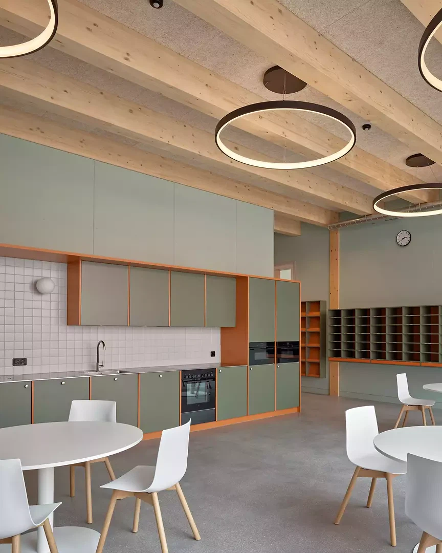 Le bâtiment est fortement ancré dans le contexte de Malters, où, dès le départ, le projet a été conçu avec du bois issu de la forêt communale – en l’occurrence la forêt de Buggeringen, visible à proximité. Dès l’annonce téléphonique du gain du concours, cette possibilité a été évoquée avec le syndic. Pour la mise en œuvre, les processus habituels d’approvisionnement en bois ont dû être adaptés. La commune a pris un risque important en acquérant le bois, pour des raisons de calendrier, avant même la votation populaire, auprès de l’organisation forestière régionale. Pour la réalisation, le matériau a été mis à disposition des charpentiers sous forme de bois rond abattu. En raison de la hausse des coûts de construction liée à la pandémie de coronavirus, il était essentiel de maîtriser les coûts et de construire avec des moyens simples. Le bâtiment repose sur une structure de base rationnelle et durable. La structure porteuse en bois reste visible en tant que « gros œuvre noble », la trame des poutres marquant l’atmosphère. En se concentrant sur l’essentiel, des économies substantielles ont pu être réalisées dans un esprit de suffisance (écologique et économique), sans que la qualité spatiale n’en pâtisse. Les élèves ont en outre pu participer à la conception chromatique dans le cadre d’un processus participatif. Plusieurs ateliers ont permis de développer des palettes colorées pour les différents espaces. La conception des couleurs a ainsi été entièrement revue par rapport au projet de concours.