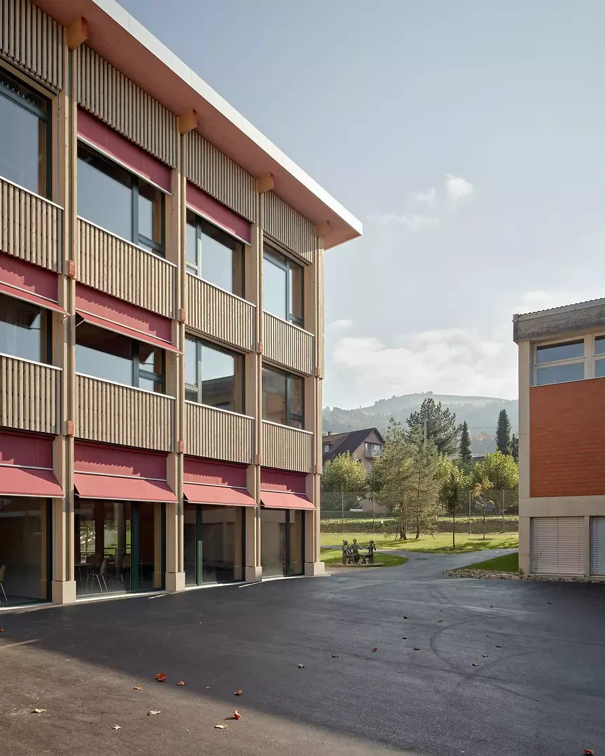 L’ensemble scolaire est entouré d’un quartier composé de bâtiments résidentiels de petite échelle. À l’est, il s’ouvre sur une vaste prairie dégagée. Le site scolaire est bordé sur trois côtés par la voie ferrée et des ruisseaux. Le volume est implanté de manière à cadrer la cour de récréation existante en son centre, tout en permettant la création, au nord, d’un parc scolaire à haute valeur écologique et, au sud, le maintien d’un espace extérieur attractif pour la pause de midi. L’accès principal au site scolaire s’effectue depuis la Muoshofstrasse à l’ouest et mène directement à la cour de récréation. Toutes les entrées des bâtiments s’orientent vers cet espace central, déjà structuré aujourd’hui par les toitures des passerelles existantes. Le nouveau bâtiment est également desservi de cette manière. L’espace extérieur entre les entrées du nouveau bâtiment est aménagé avec un revêtement perméable en gravier et des arbres, contribuant en été à la création d’un microclimat frais.