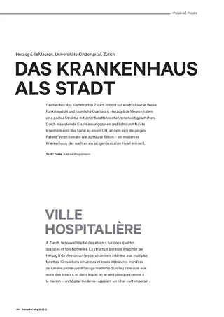 Le discours architectural actuel se délecte toujours plus de la notion de porosité, concomitante de concepts comme celui de la ville-éponge prônant les mesures à prendre contre la formation d’îlots urbains de chaleur, comme la capacité du sol à absorber l’eau de pluie. Architecturalement parlant, l’idée de porosité est associée à des bâtiments favorisant la perméabilité spatiale en ville. Karen Schmeink en donne la définition suivante dans sa thèse doctorale: «Ils [les blocs poreux] mettent en réseau l’espace public et donnent naissance à une succession d’espaces différenciés, publics, semi-publics et privés, grâce à leur morphologie physique et spatiale». L’hôpital universitaire des enfants à Zurich constitue un excellent exemple du potentiel que représente l’idée de porosité appliquée à l’architecture et à l’urbanisme. Le bâtiment de la fondation Eleonore, communément appelé «Kispi», contraction de «Kinderspital» en allemand, est signé Herzog & de Meuron. Les architectes bâlois ont profité de ce mandat pour renouer avec une réflexion menée autour du monde de l’hôpital entamée avec la réalisation à Bâle d’une clinique de neuroréhabilitation et de paraplégiologie en 1998–2002, qu’ils transformaient et agrandissaient entre 2018 et 2020. À Zurich comme à Bâle, les différents secteurs sont organisés horizontalement et non verticalement. Dans une telle structure en nappe, les services se jouxtent les uns les autres et les circulations gagnent en importance. Desservant des plans qui s’étalent et gagnent en épaisseur, elles doivent relier entre elles les différentes zones tout en assurant l’orientation et en offrant des lieux de rencontre, en plus de permettre à la lumière naturelle de pénétrer dans les parties centrales du bâtiment. La qualité de l’expérience spatiale vécue par les patient·e·s et les visiteur·se·s dépend par conséquent de l’imbrication réussie des aspects fonctionnels et des qualités spatiales dans ces zones de circulation.