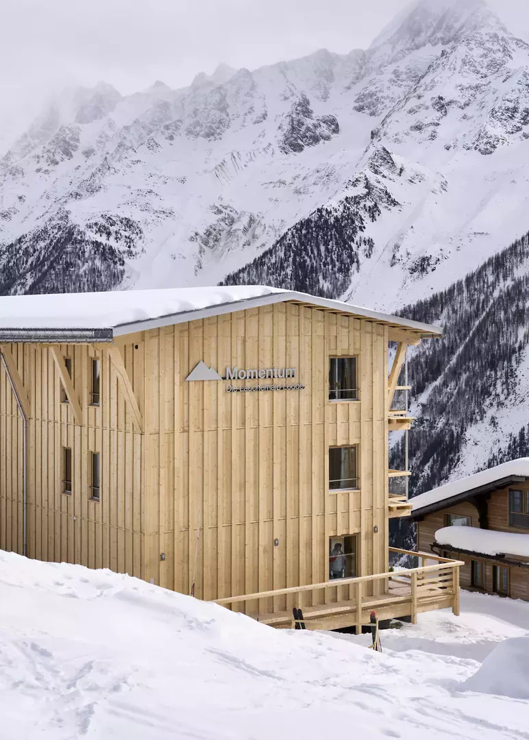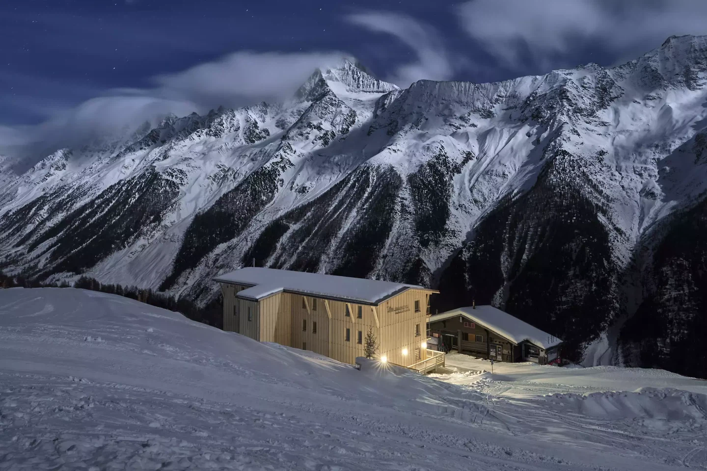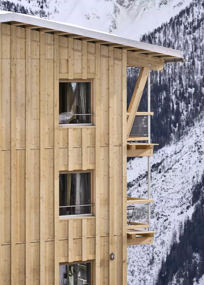 L’accès au bâtiment se fait par une terrasse ensoleillée en amont, qui organise la distribution et mène directement au local à skis et à vélos. De là, on accède à un petit salon avec réception intégrée, qui s’ouvre de manière fluide sur l’espace de séjour. L’hôtel comprend 19 chambres pouvant accueillir jusqu’à 64 hôtes, majoritairement situées dans les deux étages supérieurs et orientées vers la vallée. Chaque unité dispose de sa propre salle d’eau ainsi que de mobilier intégré. Des lits escamotables permettent différentes configurations d’occupation au sein d’un plan compact. Les balcons prolongent les chambres par un espace extérieur protégé avec vue sur la vallée et structurent, en tant que bande continue, la façade sud-est. Ils donnent de la profondeur au volume, assurent la protection solaire et établissent une transition entre intérieur et paysage.