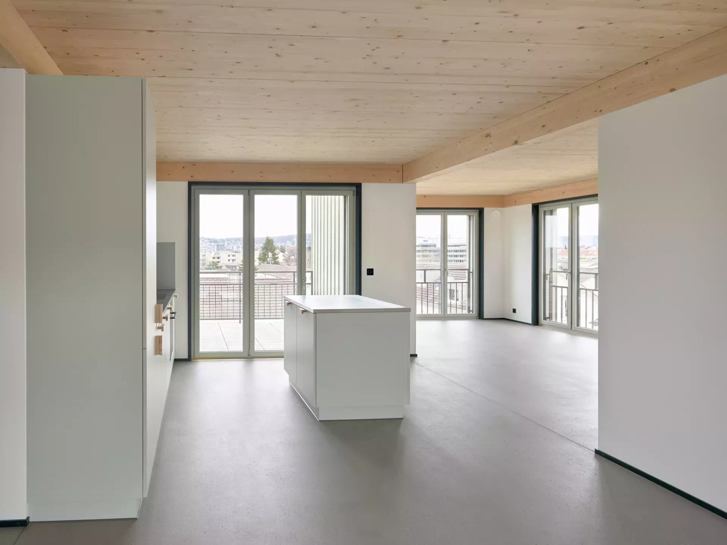 Sur le plan urbanistique, le quartier résidentiel de Heuried est marqué par la fin des années 40. Le boom immobilier de l'après-guerre a vu le passage d'un aménagement en blocs urbains à une construction en rangées. De vastes espaces verts créent un cadre de vie semblable à un parc, qui caractérise encore aujourd'hui le quartier. Le nouveau bâtiment de remplacement correspond en substance à une rangée de maisons, dans le respect des réglementations en vigueur en matière de construction. Avec sa façade étroite donnant sur la rue, le bâtiment s'intègre dans le rythme urbain. Sur son côté longitudinal, le bâtiment est en gradins vers le parc. Cette disposition en gradins offre aux appartements des orientations multiples. Les balcons s'intègrent dans chaque gradin, se fondent dans la géométrie du bâtiment et optimisent l'intimité des habitant·e·s. Mais l'étage en attique se fond également avec le corps du bâtiment pour former une forme cubique en décalage volumétrique. L'étage supérieur et l'étage en attique se distinguent légèrement par leur couleur, ce qui harmonise visuellement le bâtiment avec l'échelle des bâtiments voisins plus bas. À chaque étage, quatre appartements différents s'intègrent dans le plan en gradins. Deux grands appartements familiaux encadrent deux petits appartements. Les appartements familiaux, en particulier, offrent une grande diversité spatiale. Le vaste espace de vie au sud-est ou sud-ouest se fond harmonieusement dans la cuisine ouverte située entre les rangées de pièces sur la façade nord.