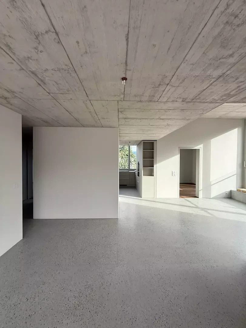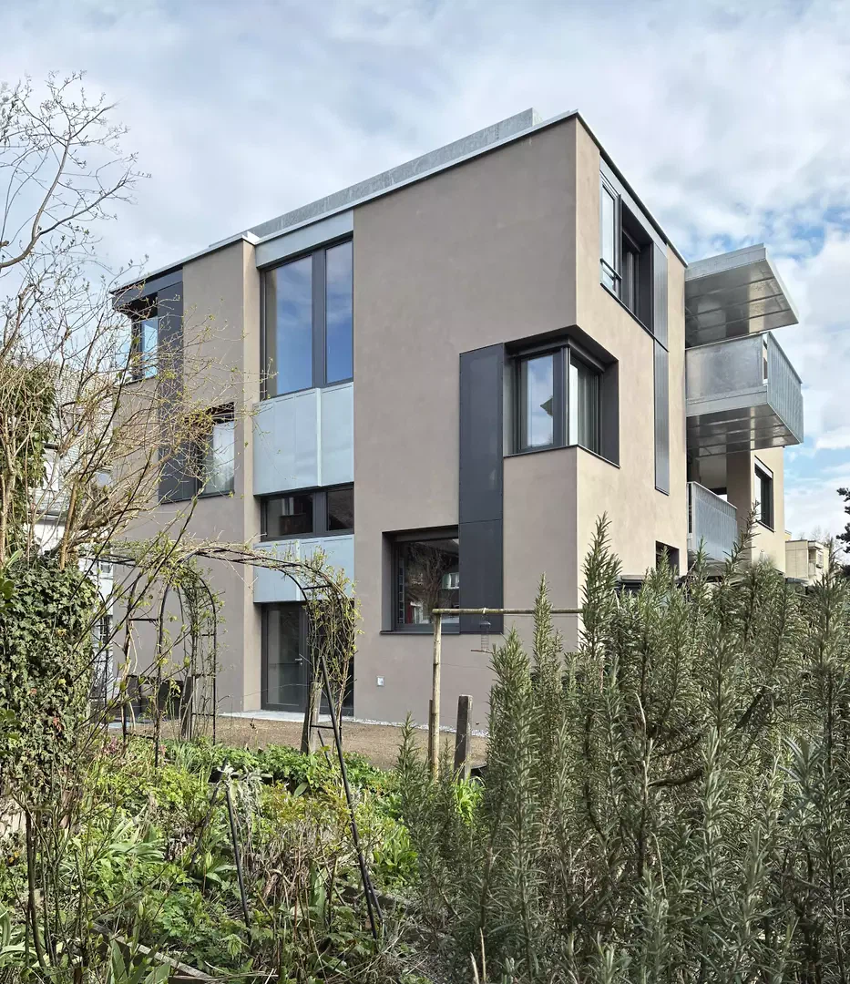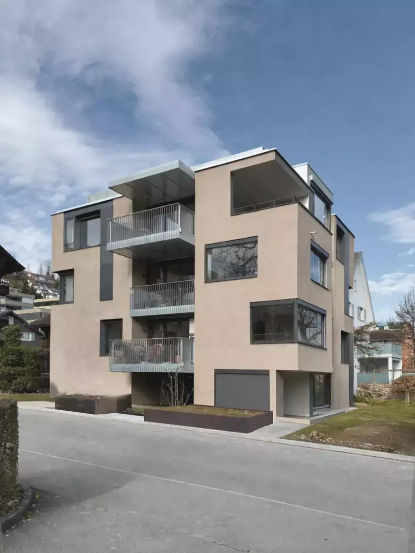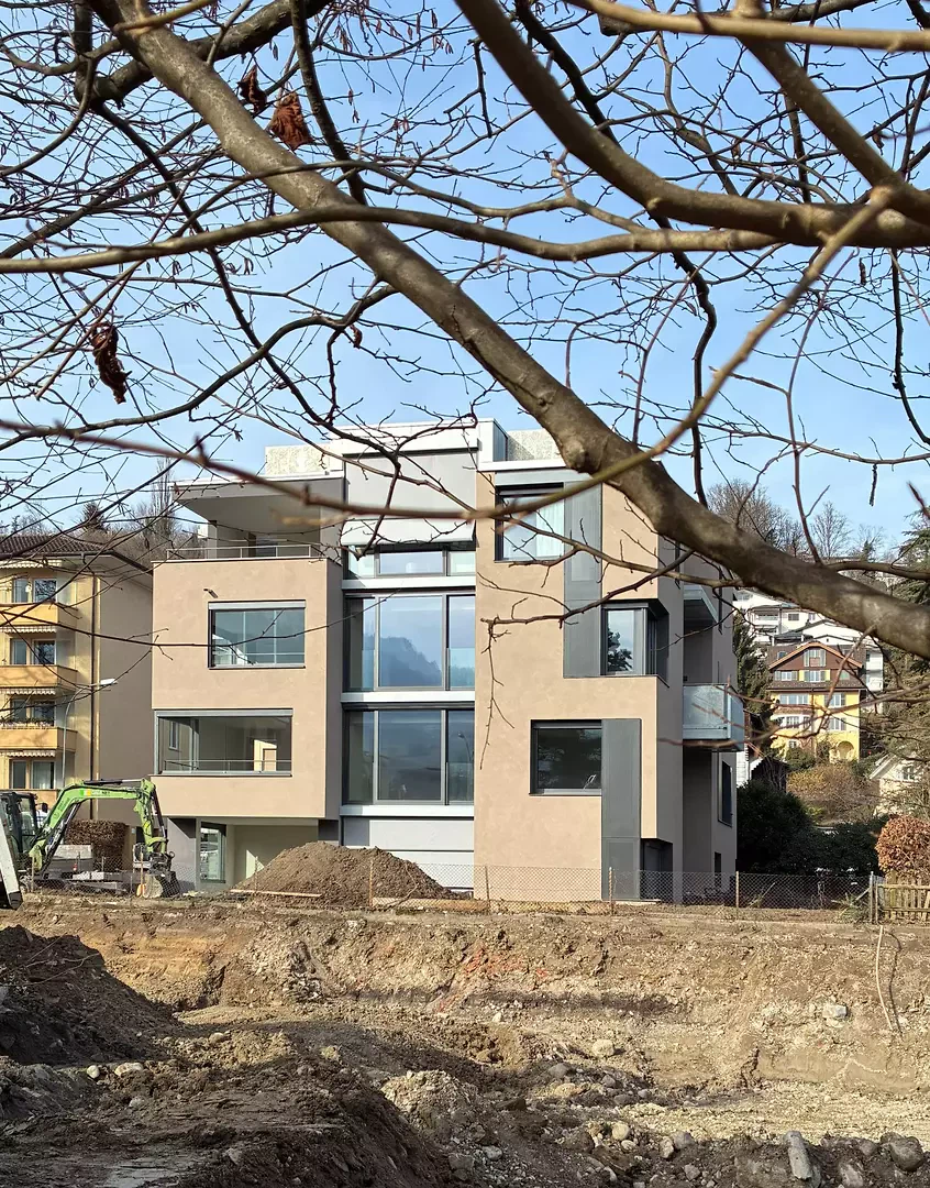 Le nouveau bâtiment est implanté au centre de la parcelle et permet une orientation sur les quatre façades ainsi qu’un éclairage optimal de tous les logements. L’objectif n’est pas de réaliser un immeuble collectif classique, mais une habitation généreuse au caractère de villa urbaine. Le plan type organise quatre pièces d’angle autour d’une zone centrale en forme de croix regroupant séjour, salle à manger, cuisine et cage d’escalier. Aux étages supérieurs prennent place trois appartements de 4,5 pièces, tandis que le rez-de-chaussée accueille un logement indépendant partiellement enterré. La distribution s’effectue par une cage d’escalier compacte au nord ainsi que par un ascenseur offrant un accès direct aux logements. Tous les appartements se distinguent par leur générosité et leurs qualités propres. Des balcons et fenêtres disposés de manière différenciée offrent des vues variées et confèrent à la façade une composition animée. Des éléments traversant plusieurs niveaux unifient le bâtiment. L’appartement en attique bénéficie en outre de hauteurs sous plafond généreuses ainsi que d’une vue sur le Pilate.