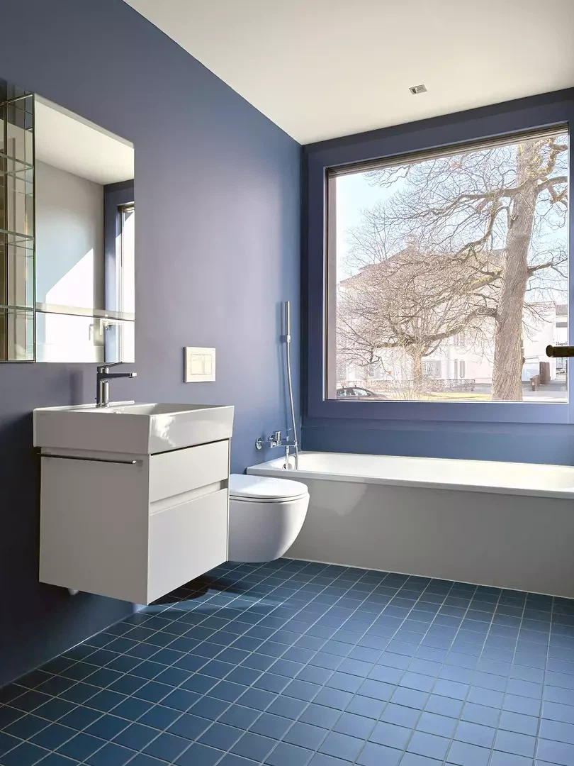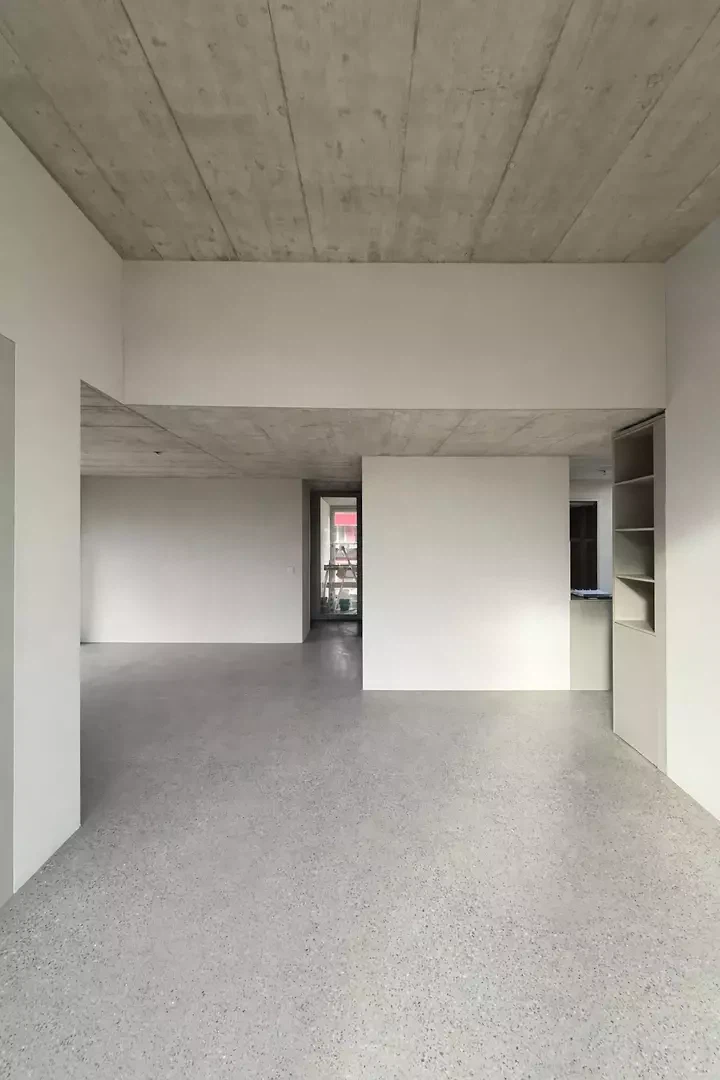 Le bâtiment est réalisé en construction massive: le sous-sol et les dalles sont en béton armé, tandis que les pièces d’angle sont en maçonnerie enduite. Les fenêtres bois-métal, déployées sur deux niveaux, créent des niches intégrées – à la manière de balcons à la française – qui structurent l’espace intérieur. La zone centrale reste volontairement «brute»: dalles en béton apparent, chape poncée et acier galvanisé à chaud pour les balcons caractérisent la matérialité. Les chambres offrent une atmosphère plus intime et contenue, renforcée par leurs proportions et le parquet sombre. Il en résulte un contraste net entre les espaces de jour et de nuit.