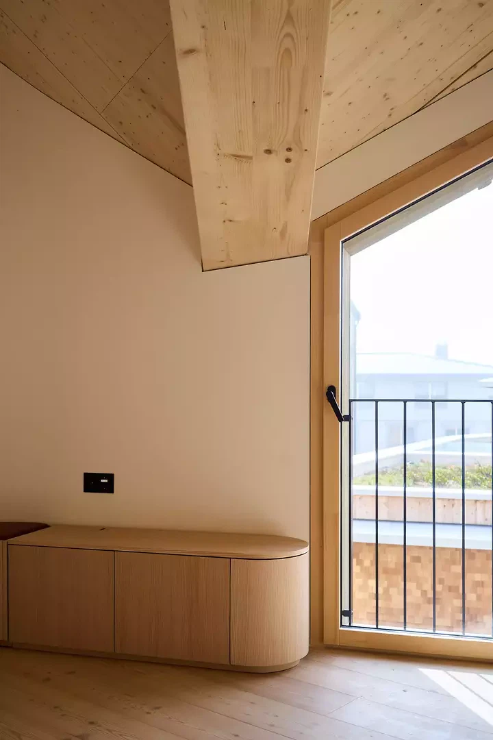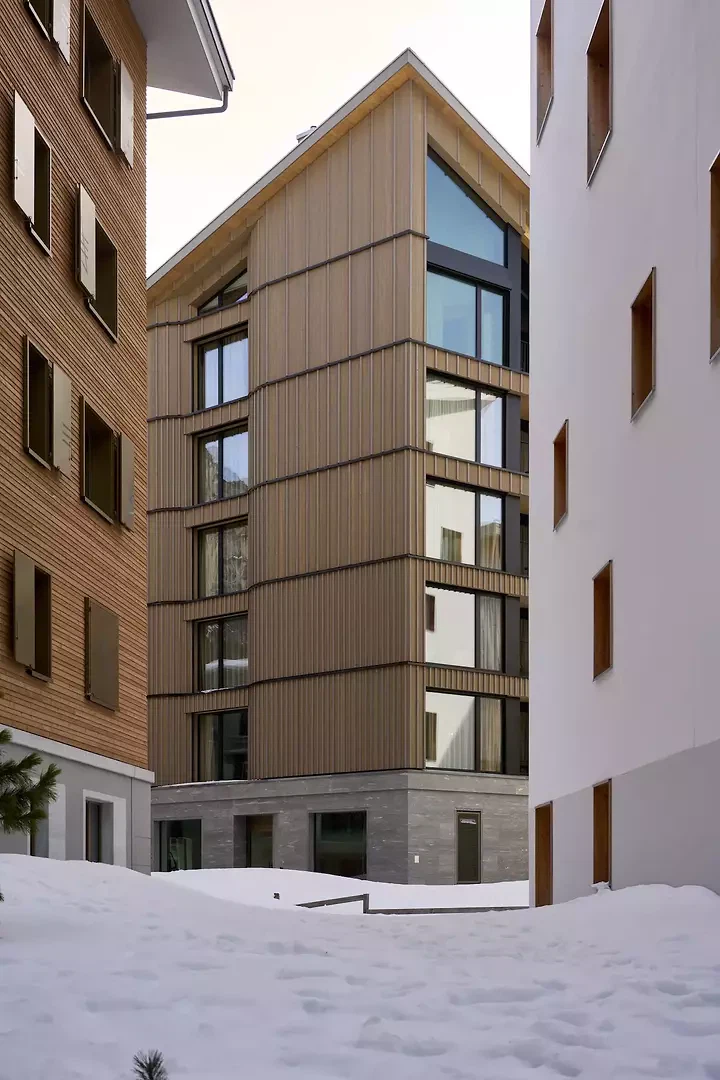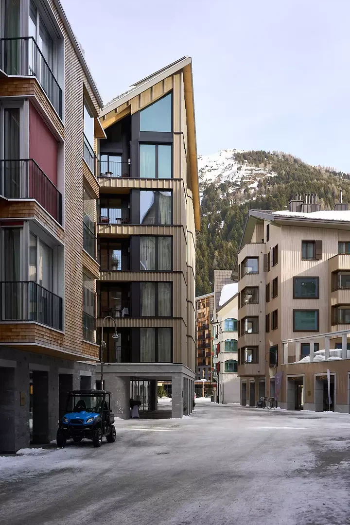 L’immeuble d’habitation La Vetta rompt avec le caractère ludique des bâtiments environnants et s’inscrit dans une architecture réduite et moderniste en contexte alpin. Il existe de nombreuses références à cet égard, à différentes échelles. Parmi les premiers exemples figurent les constructions de Clemens Holzmeister, mais aussi des structures de grande échelle, par exemple celles de Charlotte Perriand. Elles montrent comment des formes abstraites peuvent dialoguer avec des paysages rocheux façonnés par la nature. La façade, avec sa surface en bois, indique que l’ensemble du bâtiment au-dessus du socle en pierre est une construction en bois. Les matériaux naturels, utilisés avec retenue, soulignent le volume, clairement structuré par diverses découpes pour les fenêtres et les loggias. À l’intérieur également, l’expression extérieure se prolonge. Des matériaux naturels et nobles, des textures douces et du mobilier artisanal créent un environnement à la fois original et élégant. Le caractère du style alpin traditionnel est enrichi d’une subtile touche d’élégance, qui confère à l’ensemble une atmosphère sophistiquée et raffinée. L’immeuble La Vetta à Andermatt Reuss comprend au total 18 appartements de 3,5, 4,5 et 5,5 pièces. Le rez-de-chaussée accueille une surface commerciale ainsi qu’un espace spa/fitness destiné aux résident·e·s. Le projet, conçu en 2011, a pu être réalisé tel que nous l’avions imaginé en tant que jeunes architectes, grâce aux avancées significatives de la construction en bois au cours des dernières années, sans nécessiter d’adaptations majeures.