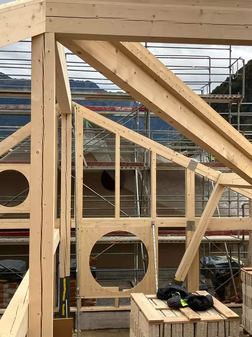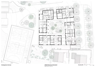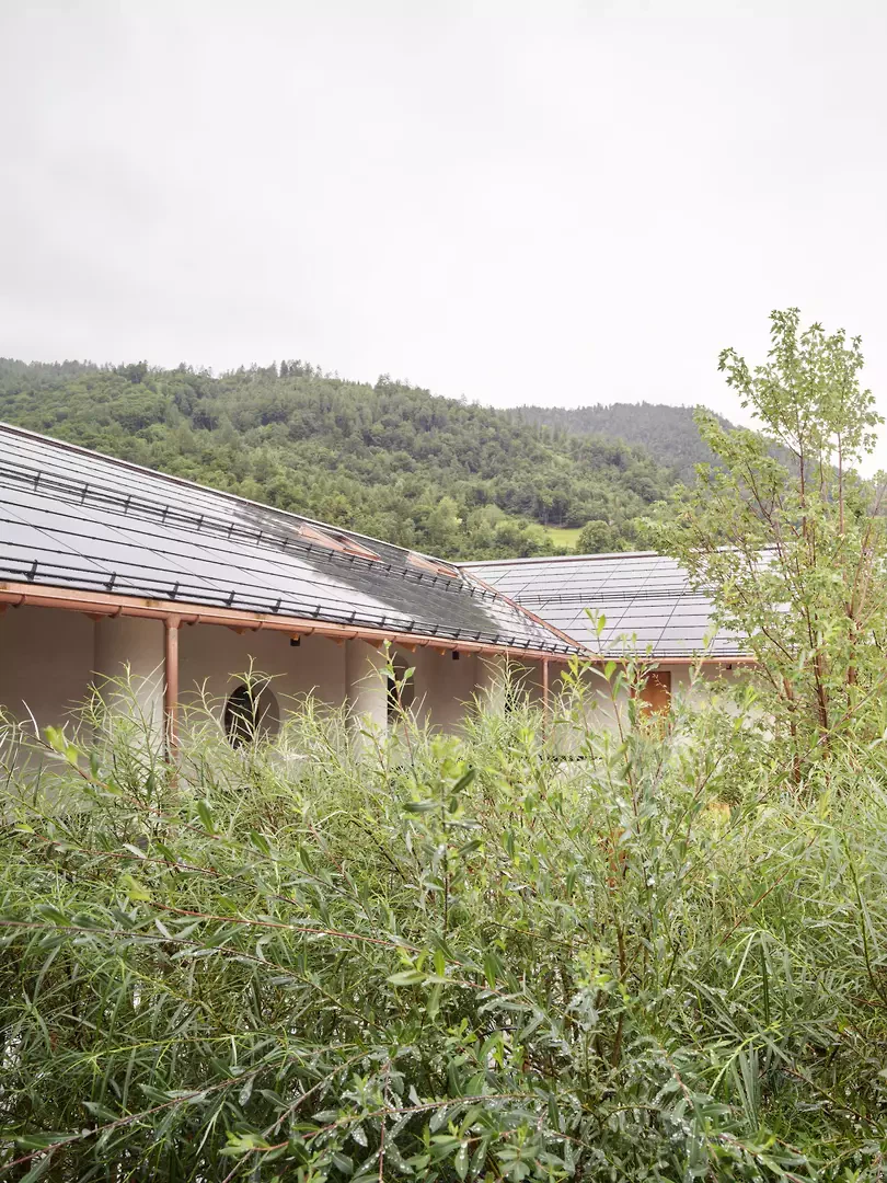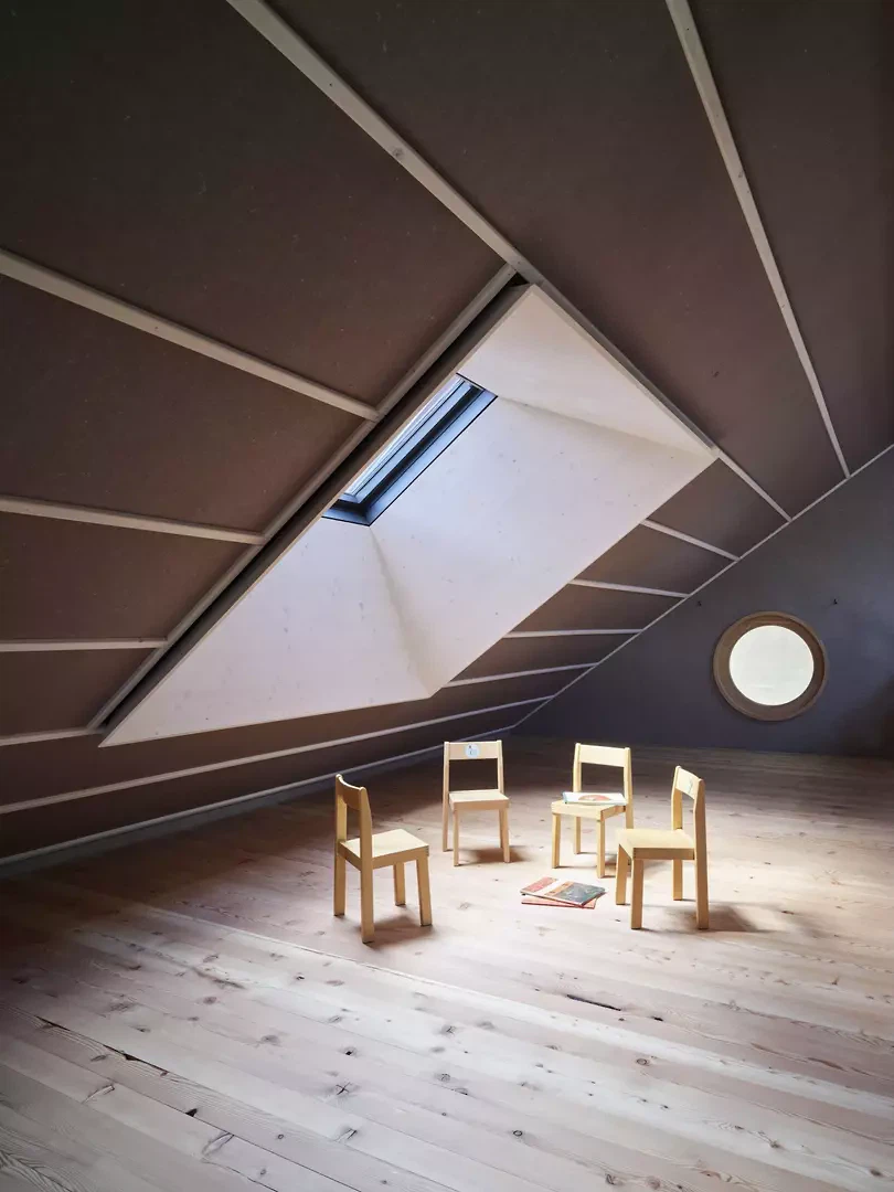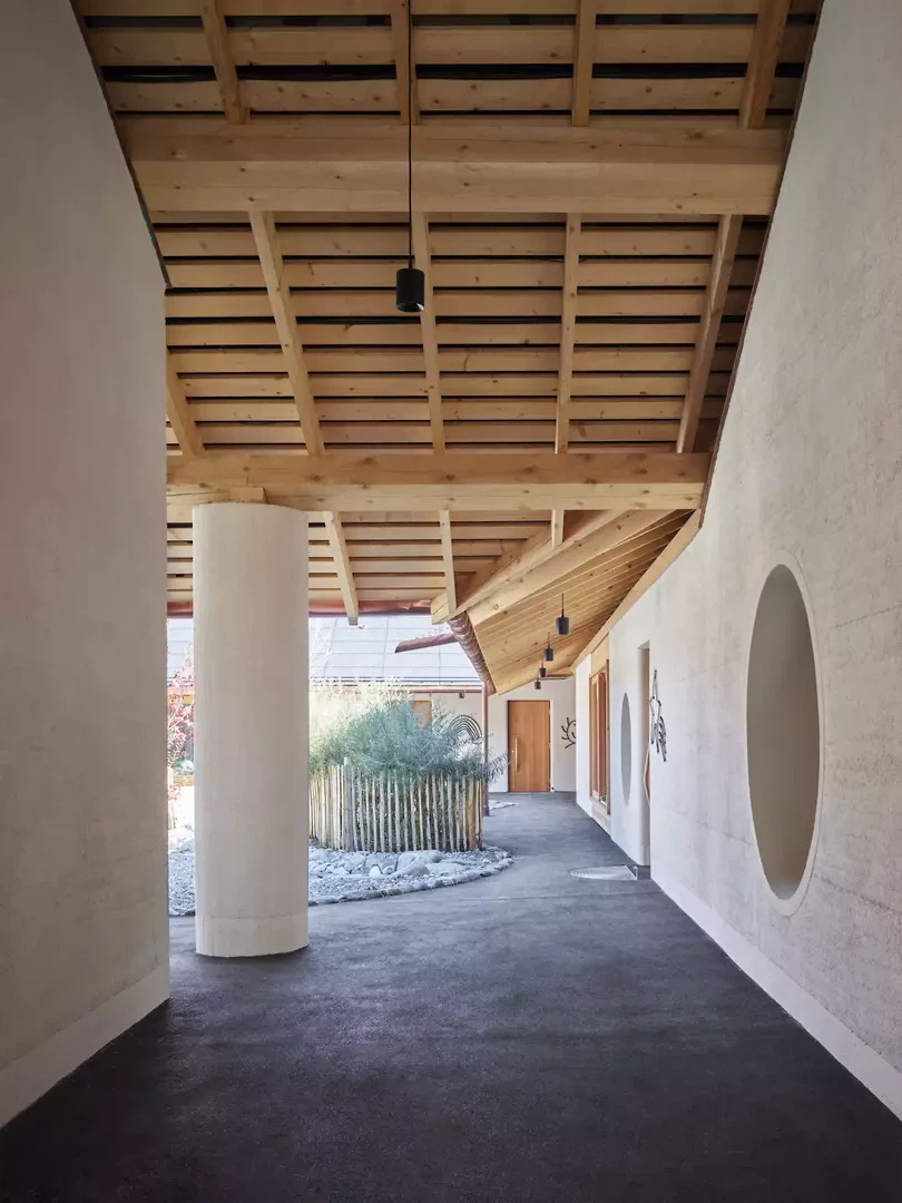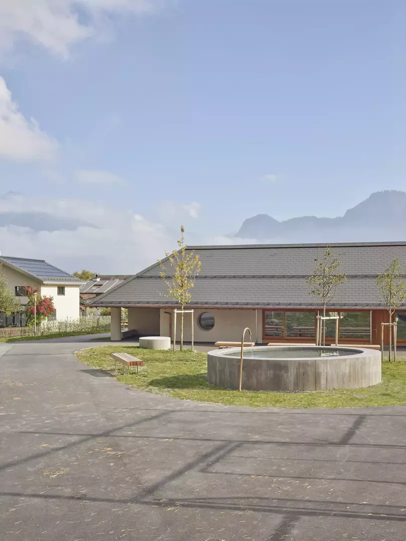 Le nouveau bâtiment marque l’entrée du site scolaire central et le délimite à l’est. Grâce à son organisation de plain-pied, à sa toiture à deux pans continue et à la structuration des façades, il parvient, malgré son volume important, à établir une transition entre les bâtiments scolaires et les maisons individuelles voisines, tout en créant une échelle adaptée aux enfants. Le jardin d’enfants, la cantine/accueil parascolaire et le groupe de jeu s’organisent autour d’une cour intérieure sous une grande toiture. Des espaces extérieurs généreux et couverts se développent entre ces entités. La légère pente du terrain permet la création d’un niveau de soubassement intégrant un parking villageois. Les quatre unités du jardin d’enfants sont accessibles depuis la cour intérieure, chacune disposant de sa propre entrée. La cantine/accueil parascolaire s’oriente vers le site scolaire et forme, avec le nouveau terrain de sport, un espace de séjour supplémentaire avec fontaine, tables et bancs. Le groupe de jeu est orienté au sud, en direction de l’aire de jeux publique. Le mur de 52 centimètres d’épaisseur, en chanvre-chaux et ouvert à la diffusion de vapeur, assure à la fois la séparation des espaces et l’isolation thermique. Le bois de la structure porteuse et des aménagements intérieurs provient de la forêt communale et n’est pas collé. La laine de mouton, le bois et l’enduit en terre assurent une acoustique intérieure agréable. Le bâtiment fonctionne avec une technique minimale, sans ventilation mécanique ni système de refroidissement.