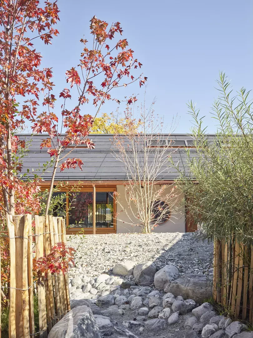Le jardin d’enfants d’Untervaz est conçu comme un lieu de protection et de sécurité, où les enfants peuvent exprimer leur besoin naturel de mouvement et s’approprier leur environnement de manière autonome. Des matériaux naturels créent une atmosphère sensorielle qui favorise le développement des enfants durant cette phase déterminante de leur vie. L’architecture soutient le travail pédagogique des enseignants. Le chanvre-chaux, les bois locaux, les enduits en terre et le feutre de laine de mouton génèrent une ambiance intérieure apaisante. À l’extérieur, le sable et les pierres, l’eau ainsi que les graminées, arbustes et arbres offrent des expériences naturelles stimulantes. La lumière du soleil et l’ombre sont perçues directement, et le passage des saisons devient une expérience sensible.