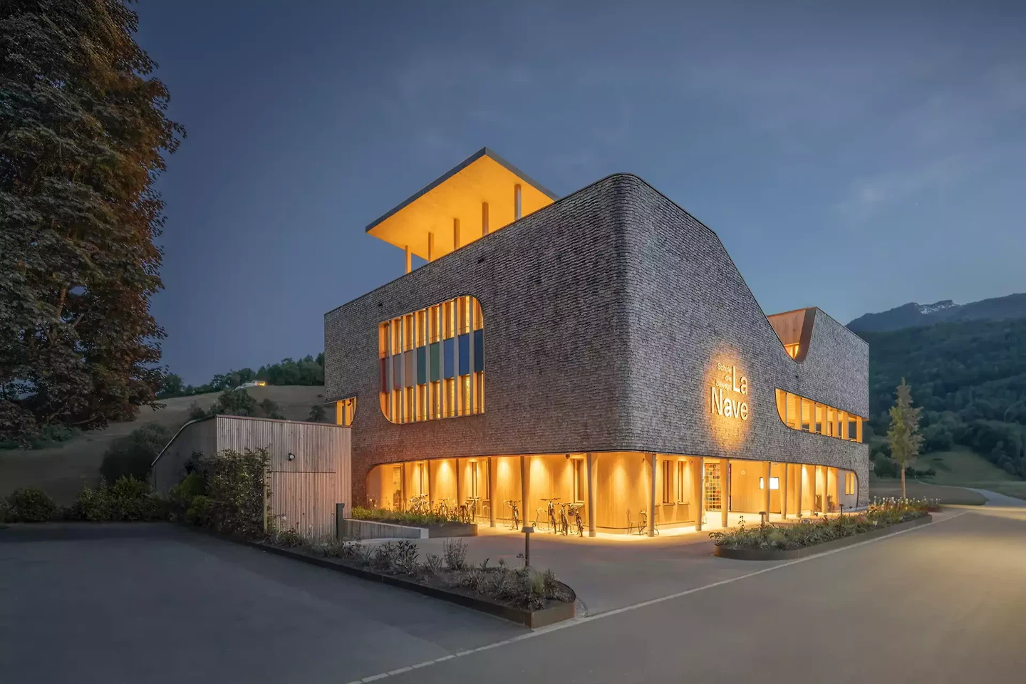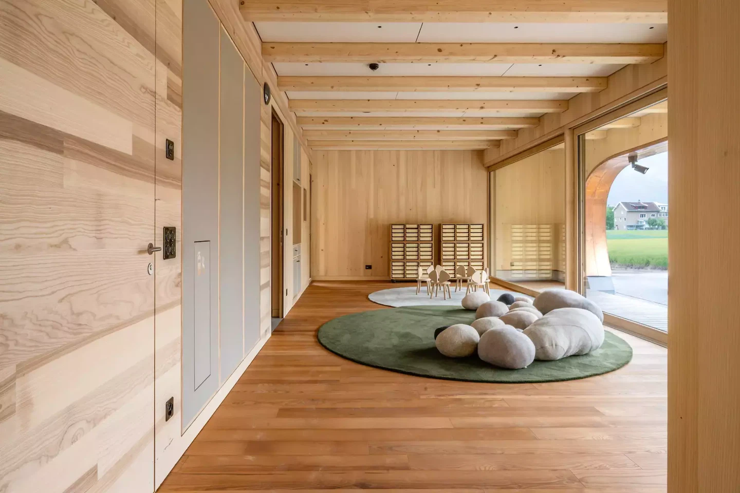 La matérialité du bâtiment est étroitement liée à l'approche pédagogique. La façade composée de bardeaux de bois de différentes tailles témoigne de la diversité et du caractère unique de chaque enfant. Les formes libres des fenêtres soutiennent ce concept et apportent des accents individuels sans déséquilibrer la forme globale. Le bâtiment communique ainsi à l'extérieur les mêmes valeurs qu'il incarne à l'intérieur : individualité, ouverture d'esprit, développement et une culture d'apprentissage axée sur l'épanouissement et la personnalité.