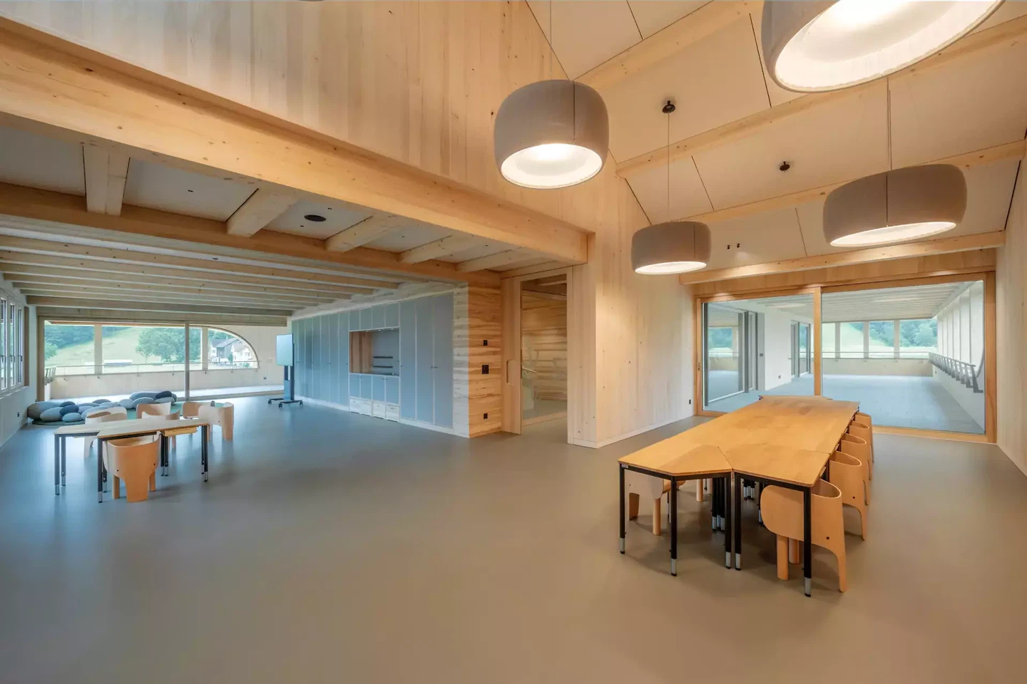 Au rez-de-chaussée se trouve l'aula, un vaste espace de rencontre et d'événements. Juste à côté, la cuisine scolaire complète l'aménagement des locaux et permet d'organiser des activités communes et d'intégrer la pratique quotidienne dans le fonctionnement de l'école. De nombreuses niches et zones d'apprentissage sont réparties dans tout le bâtiment, favorisant les formes d'apprentissage individuelles et permettant une routine quotidienne variée. Au sous-sol se trouve le « Brütwerk », un atelier polyvalent dédié au bricolage. Il sert de salle pour les cours de travaux manuels, mais est également à la disposition des élèves en dehors des cours. Le Brütwerk favorise le travail axé sur des projets, encourage la créativité et permet aux enfants et aux adolescents de développer leurs propres idées et de les mettre en œuvre de manière artisanale.
