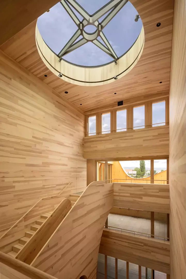 L'organisation du bâtiment suit un concept pédagogique clair: le groupe d'apprentissage le plus jeune se trouve au rez-de-chaussée, les niveaux supérieurs sont disposés au-dessus. Ainsi, pendant leur formation, les enfants et les adolescents traversent symboliquement le bâtiment de bas en haut. Ce parcours éducatif vertical est rendu visible dans l'espace par l'escalier central. Il relie tous les étages, crée des zones informelles d'échange, offre un espace pour l'apprentissage commun et s'ouvre sur l'extérieur au dernier étage. Sur le toit, l'escalier se transforme en salle de classe en plein air, qui peut être utilisée comme espace d'apprentissage et offre une vue sur les environs. L'escalier avec sièges n'est donc pas seulement un élément de circulation, mais aussi la colonne vertébrale spatiale centrale de l'école. Il structure le bâtiment, relie les étages, crée une qualité de séjour et devient un lieu identitaire. Il est complété par un toboggan ludique qui relie les étages supérieurs. Cet élément favorise le plaisir de bouger, encourage une utilisation intuitive de l'espace et renforce l'atmosphère adaptée aux enfants.
