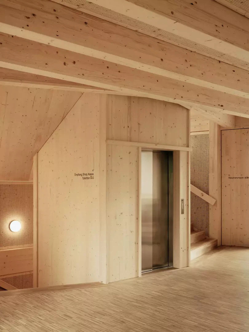 La parcelle triangulaire, présentant une pente transversale de six mètres dans la zone thermale près de l’hôtel Alpenrose, autorisait une surface bâtie maximale de 200 mètres carrés. Ces conditions ont conduit à une superposition du programme sur trois niveaux – un trio architectural – reposant sur un plan rhomboïdal. Un espace d’accueil situé à l’étage inférieur, en relation avec l’hôtel, est relié par un généreux escalier au sud du bâtiment ainsi que par une ouverture zénithale à l’étage de séminaire supérieur et à l’entrée depuis la Vordere Schwendistrasse. Un niveau plus haut se déploie un espace d’exposition couvert par une vaste toiture à chevrons. Un ascenseur relie les trois niveaux. Le volume spécifique du bâtiment résulte du plan en losange, qui s’inscrit différemment dans le terrain sur chacun de ses côtés et qui, combiné à la toiture à deux pans largement en porte-à-faux, génère une figure marquante et mémorable. La façade est structurée par une stratification horizontale en gradins vers l’extérieur, exprimant ainsi la tripartition du programme.