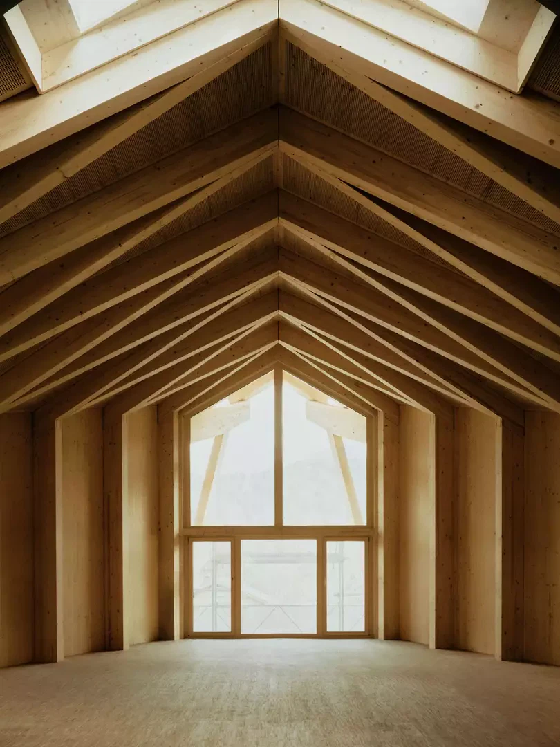 Avec son programme à plusieurs strates, la maison conçue en construction bois offre orientation et protection tout en mettant à disposition un lieu destiné aux manifestations et aux expositions. L’échange, la communauté et la transmission de l’univers sonore de Peter Roth en constituent le cœur. Ces contenus trouvent leur écho dans la forme du volume bâti, dans son élaboration constructive autonome et dans le rythme de la façade.