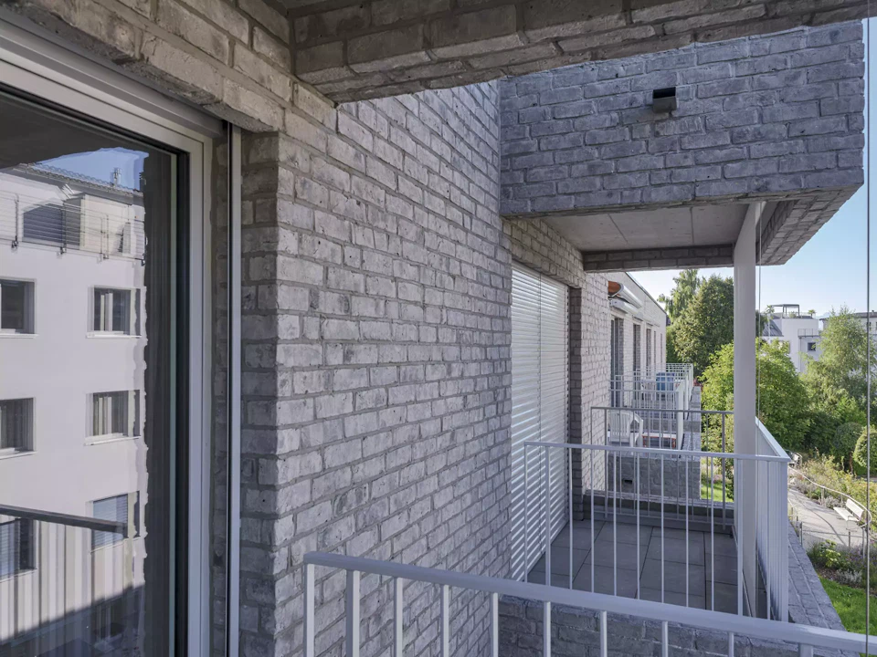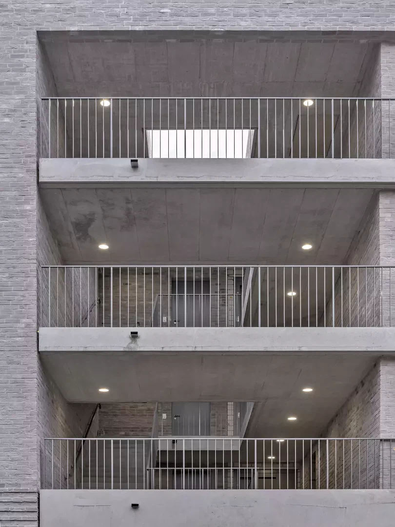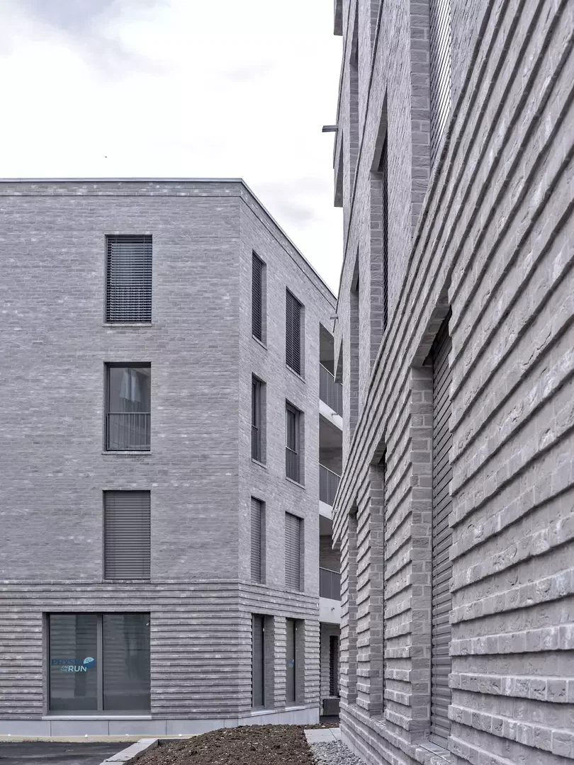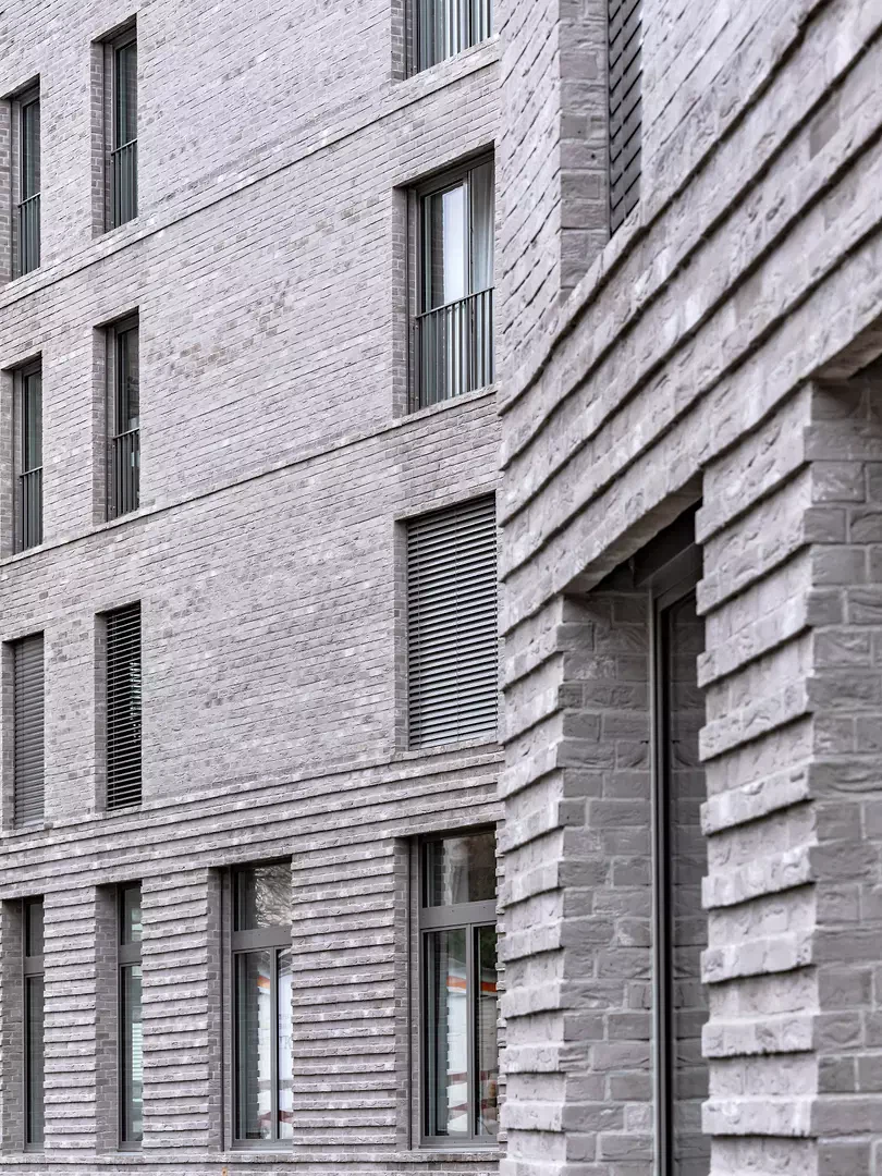 Les façades sont principalement revêtues de plaquettes de clinker dans différentes nuances de gris, un matériau qui évoque les anciens bâtiments industriels et artisanaux. Cette matérialité affirmée unit les volumes variés, mais apparentés, des bâtiments. Les cages d’escalier ouvertes apparaissent comme des bandes claires en béton intégrées aux façades.