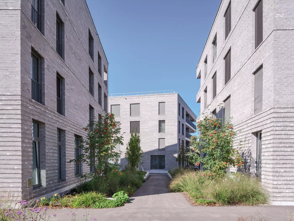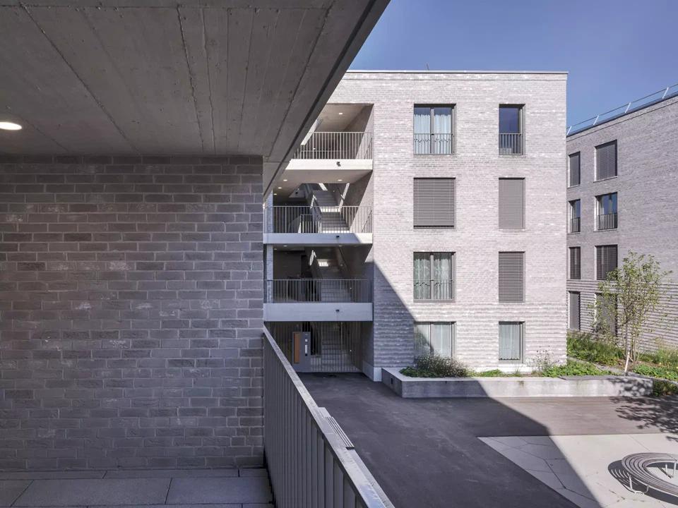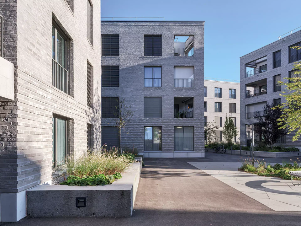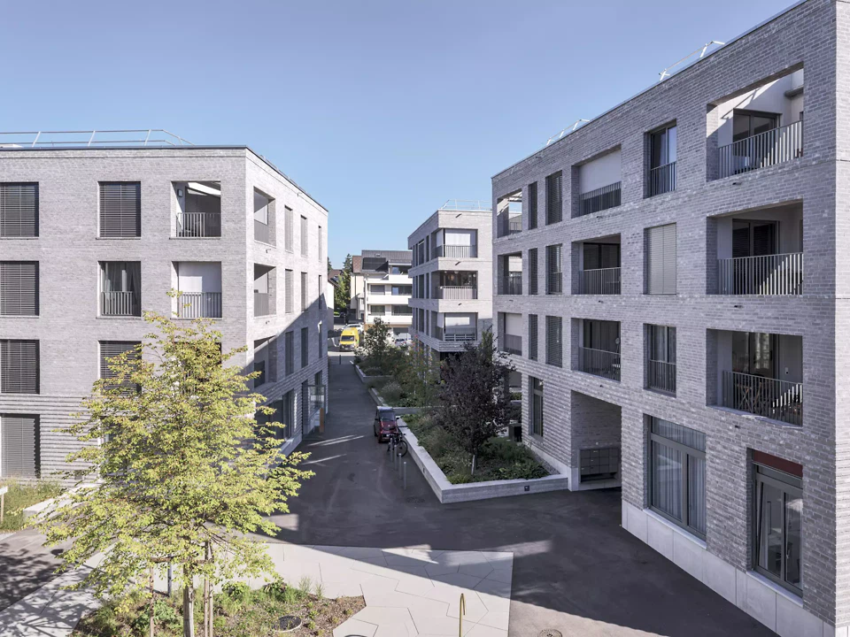 Les immeubles d’habitation se distinguent par leur volumétrie, leur nombre d’étages et leur orientation. Ils se situent le long de la Hinwilerstrasse ainsi qu’au cœur du quartier, en retrait. Deux bâtiments résidentiels et l’EMS s’alignent sur la rue et définissent l’espace public. En arrière-plan, les autres constructions sont disposées librement sur le site, générant entre elles des espaces urbains variés. Des places arborées et des venelles relient les bâtiments et leurs entrées, tandis que les cheminements s’ouvrent vers les parcelles voisines. L’ensemble forme une composition urbaine forte et autonome.