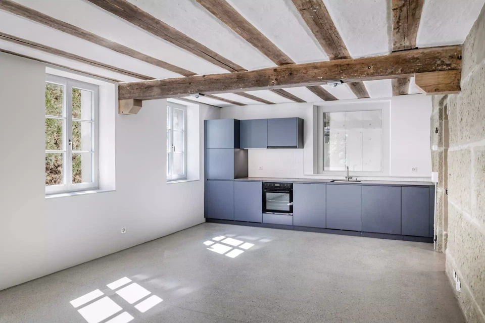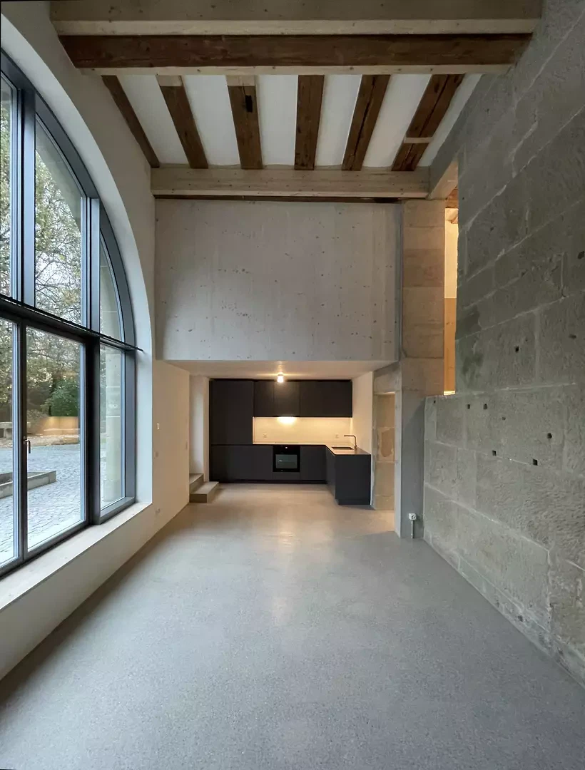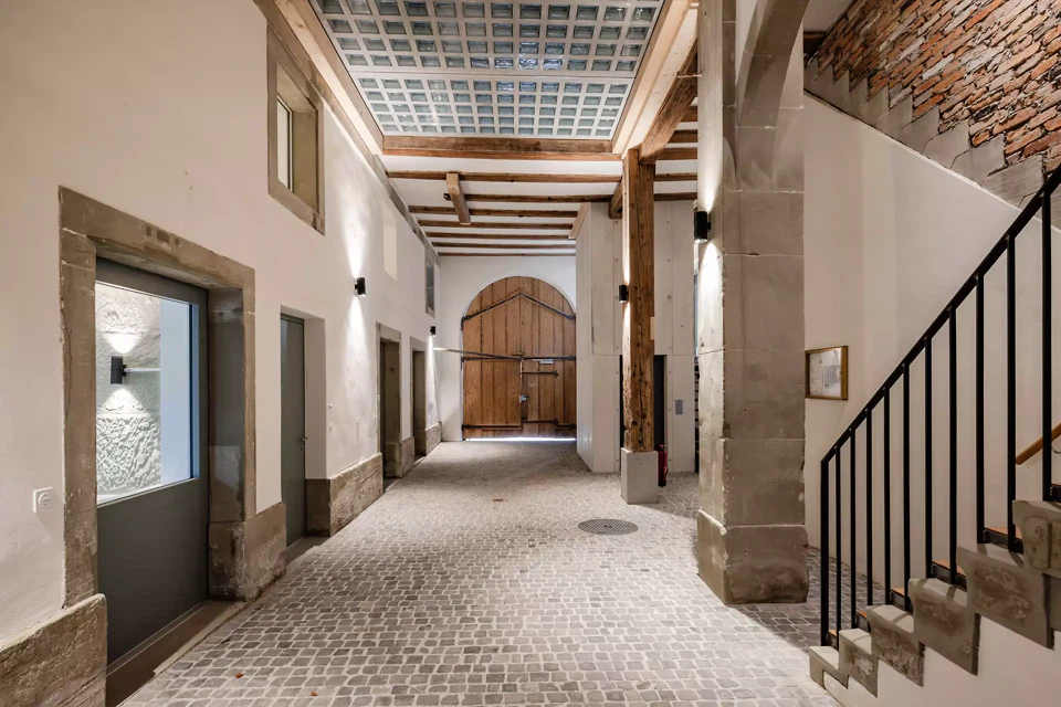 Dans le cadre de la transformation, douze logements ont été créés, accompagnés d’espaces communs. L’ancien fenil, avec ses portails en arc en plein cintre caractéristiques, est particulièrement marquant. Cet espace sert aujourd’hui de vaste zone de distribution, également utilisée comme espace communautaire. Depuis cet endroit, on accède aux logements ainsi qu’à l’impressionnante charpente, conservée dans sa structure d’origine. Trois lofts y ont trouvé place. Un patio intérieur permet à la lumière naturelle de pénétrer jusqu’au cœur du bâtiment. La structure tripartite du bâtiment – partie sud, centrale et nord – a été conservée et constitue l’ossature spatiale des nouveaux logements. La transformation a suivi une approche architecturale claire : l’existant a été conservé partout où cela était possible. Ce n’est que là où les structures porteuses ne répondaient plus aux exigences actuelles que des interventions ciblées ont été réalisées. Les nouveaux éléments sont lisibles comme des ajouts contemporains et s’inscrivent dans un contraste assumé avec la substance historique. Il en résulte un ensemble qui respecte le passé tout en répondant aux exigences du présent.