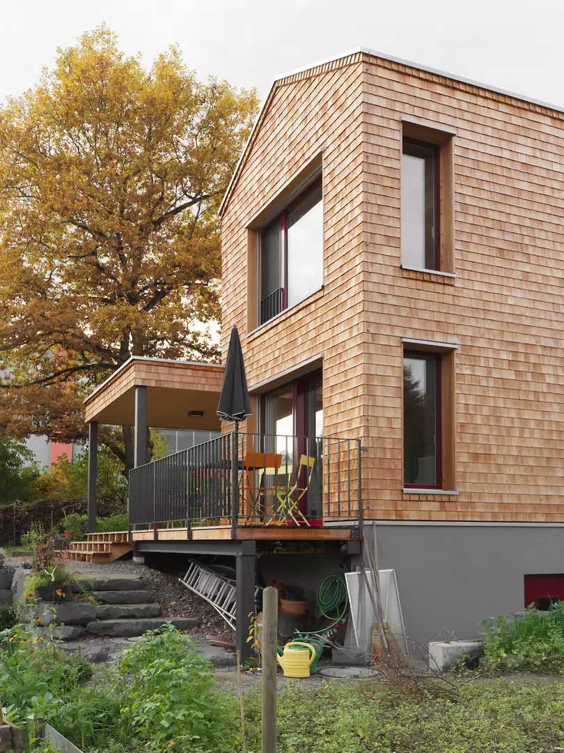En raison de l’orientation par rapport au jardin et aux plantations existants, de l’exposition au sud et du volume minimal du nouveau bâtiment, une maison d’habitation de deux niveaux a été réalisée. Le décalage longitudinal, les terrasses et les avant-toits génèrent une multitude de niches et d’espaces de séjour en interaction avec l’extérieur, invitant à la détente à toute heure de la journée selon l’ensoleillement. Le bâtiment dans son ensemble séduit par sa sobriété et son intégration dans le site. Des accents architecturaux sont apportés par la fenêtre-banc orientée à l’ouest, la forme de toiture aux multiples déterminations ainsi que par le positionnement réfléchi des ouvertures en façade.