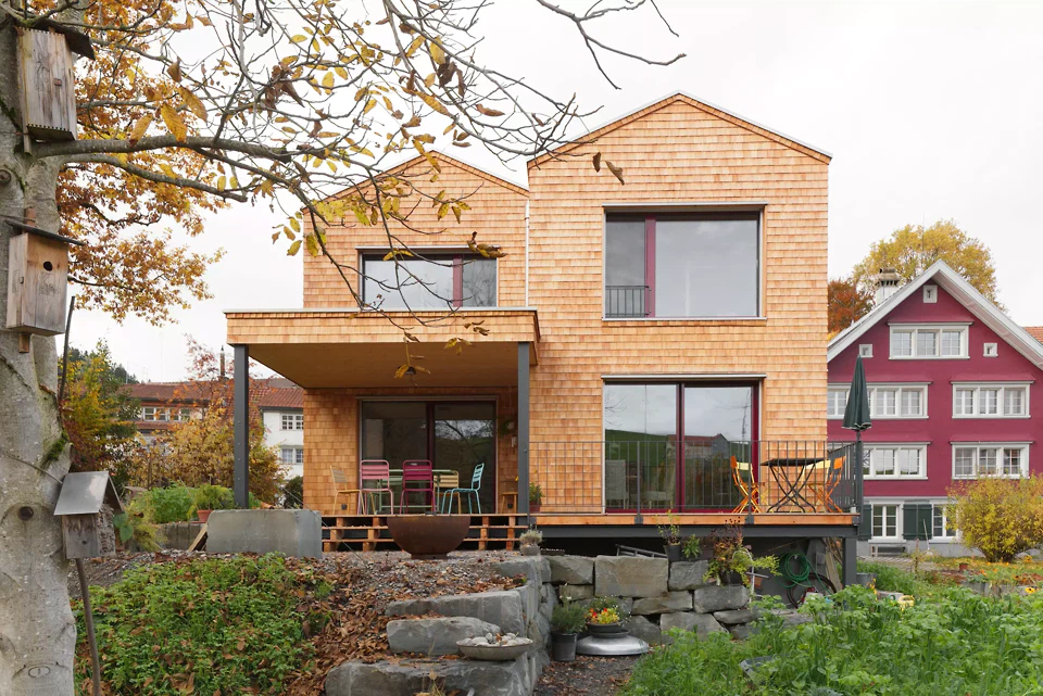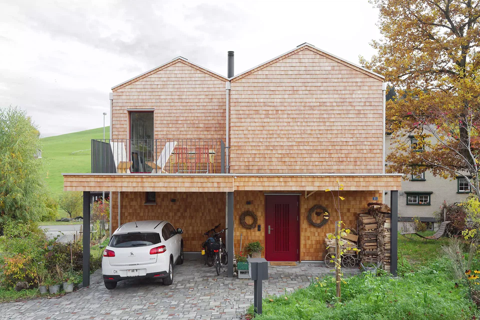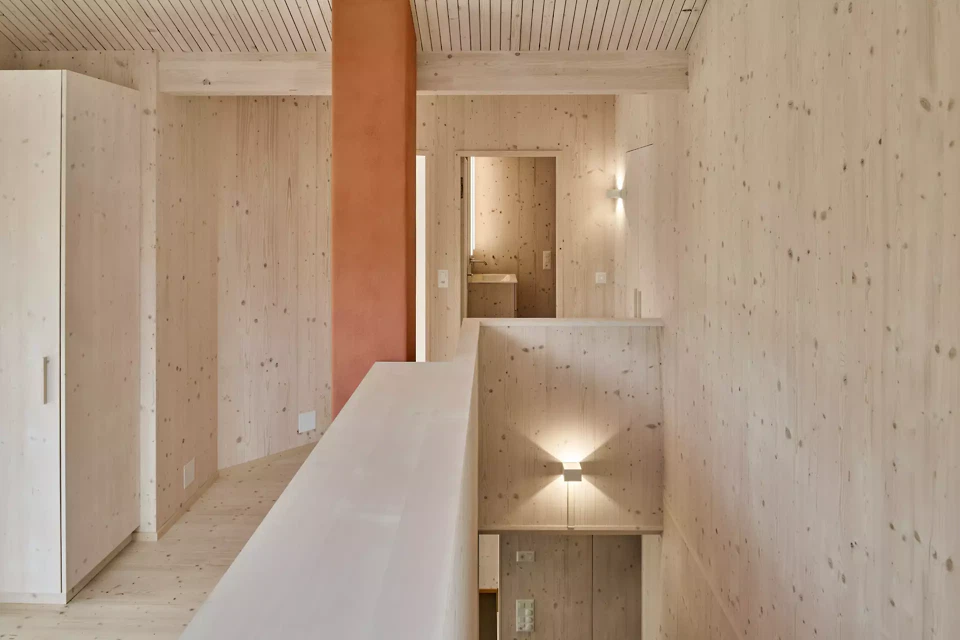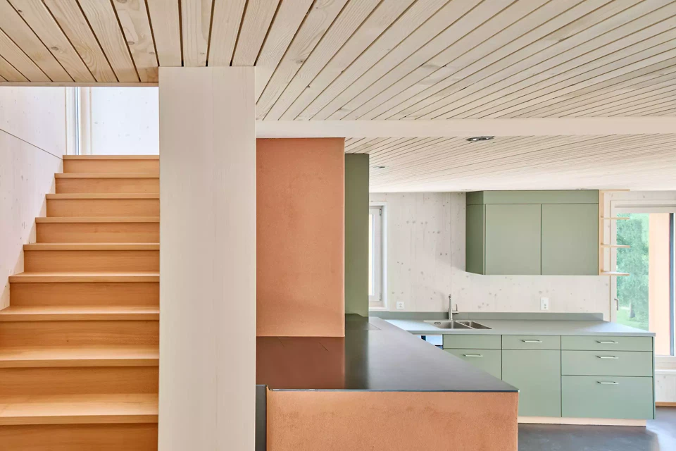L’écologie, la proximité avec la nature et l’artisanat régional ont également été prioritaires dans la réalisation. Le maître d’ouvrage a ainsi opté pour une construction en éléments de bois massif, complétée par une isolation extérieure en fibres de bois et des façades en bardeaux ventilés. Le bois lunaire utilisé provient de la région de Suisse orientale et est assemblé en un système de bois massif à partir de planches d’épicéa croisées et reliées par des chevilles en bois. À l’intérieur, la plupart des éléments en bois restent apparents, générant un caractère spatial « brut » et pragmatique. En contraste, les éléments intégrés introduisent des accents de couleur et de matière, comme la cuisine aux façades en linoléum, le poêle de masse en terre, les parois de douche en tadelakt et le sol en terre sombre du rez-de-chaussée. Les couleurs complémentaires rouge et vert, ainsi que la composition architecturale, renforcent le lien avec l’espace extérieur.