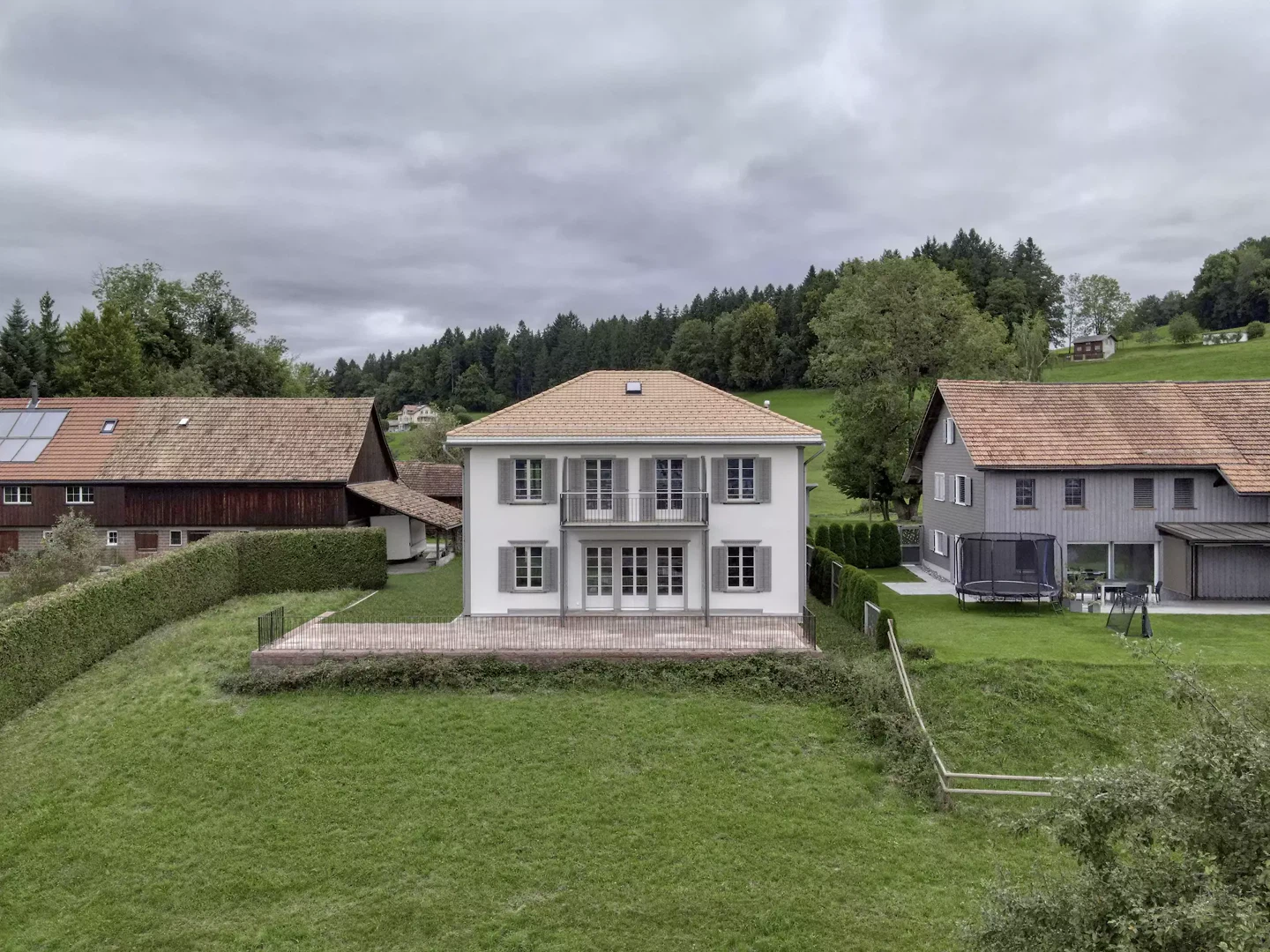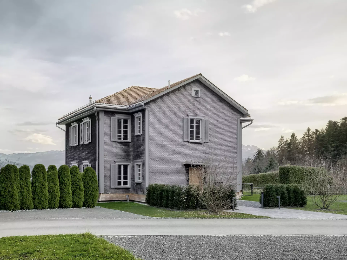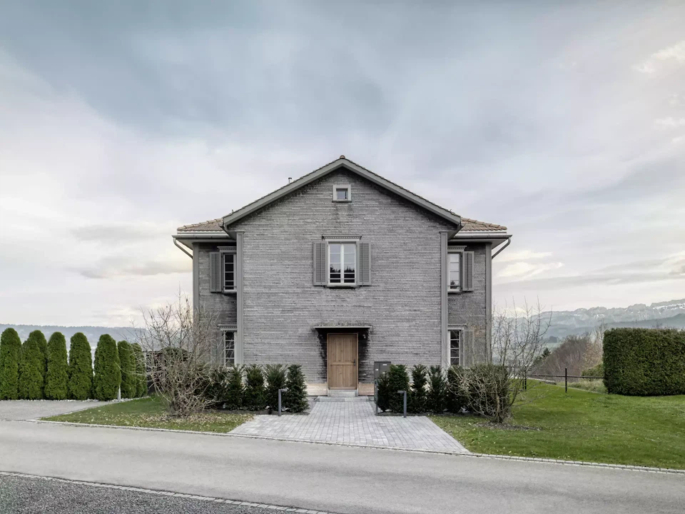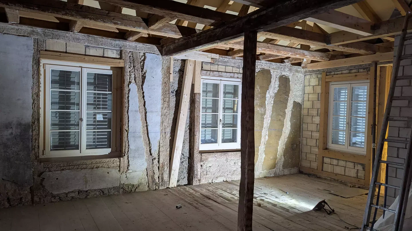 Le projet situé dans la zone agricole de Gaiserwald prévoit la réalisation de deux appartements de trois pièces et demie dans une enveloppe bâtie existante, inoccupée depuis des décennies. Celle-ci se compose, sur trois façades, d’une structure en pan de bois bardée de bardeaux et maçonnée. La quatrième façade, orientée au sud en direction de l’Alpstein, est enduite. Toutes les fenêtres en bois sont habillées d’encadrements et d’un bandeau en bois. Le toit en croupe avec pignon transversal est couvert de tuiles plates posées à simple recouvrement. La structure en bois est volontairement conservée, tout en étant adaptée aux nouvelles exigences, tant sur le plan de la physique du bâtiment que sur le plan statique. L’aspect extérieur demeure ainsi inchangé, et les prescriptions de la zone agricole sont respectées. Les interventions constructives se limitent à l’aménagement intérieur ainsi qu’à l’intégration de deux appartements de trois pièces et demie en construction bois. Un nouveau parvis à l’entrée, servant également d’espace de jeu et de séjour, viendra améliorer la situation d’accès à la propriété et valoriser les abords.
