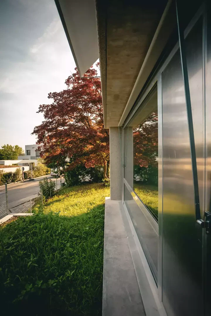 Cette structure forme le socle spatial et crée la scène pour l’interaction de deux matériaux élémentaires. Des poteaux et des escaliers en béton coffré rencontrent des murs massifs en terre crue – deux matériaux dont la différence de dureté et de profondeur façonne l’atmosphère spatiale. Trois dalles en béton coulé définissent l’organisation verticale: en bas, les espaces de service et de stockage; au milieu, la zone de vie commune; en haut, les espaces privés. La construction reste visible, son ordre clairement lisible. Face au squelette technique en béton et aux profilés en aluminium bruts, une seconde couche de matériaux se déploie: les murs massifs façonnés à partir de l’argile du terrain. Respirants, régulateurs climatiques et acoustiquement doux, ils forment le contrepoids terrestre à la rigueur minérale du béton. Le contraste génère une tension qui unit robustesse, chaleur et sérénité. La forme du bâtiment réagit de manière différenciée à la ville et au paysage. En aval de la pente, une large vitrage s’ouvre sur une vue dégagée sur Bâle et la région du Rhin. En amont, une façade en bois finement structurée, lasurée et équipée de volets rabattables, protège et dialogue avec le voisinage à petite échelle. L’implantation suit précisément la topographie: en terrasses plutôt qu’en nivellement. Grâce à l’orientation solaire, à l’échelonnement en profondeur et aux auvents, un profil réactif au climat et économe en énergie émerge.