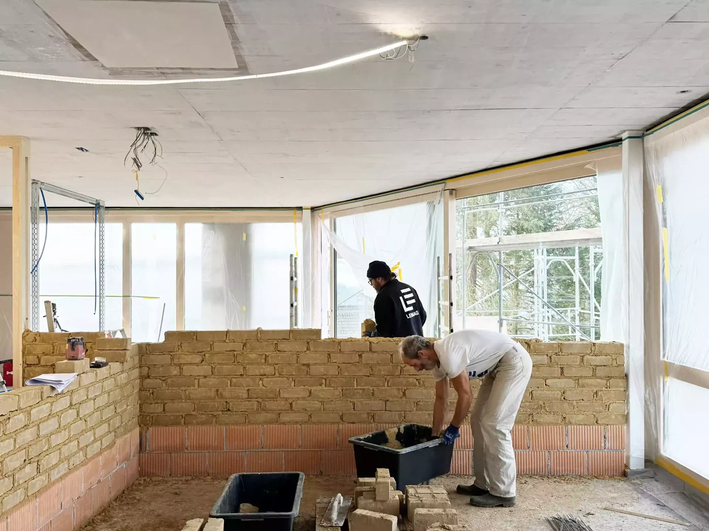 Grâce à la réutilisation du béton recyclé et à son obtention durable par démolition contrôlée, les maîtres d’ouvrage peuvent améliorer l’énergie grise de leur bâtiment. La réutilisation des matériaux de construction n’est pas une innovation récente. Dans l’Antiquité et au Moyen Âge, il était courant de réutiliser les matériaux des anciens bâtiments pour les nouvelles constructions. Avec la prise de conscience des processus de construction durables à la fin du XXe siècle, cette pratique ancienne a été reprise et perfectionnée grâce à la technique et à l’innovation modernes. La mise en œuvre des briques de terre crue locales pour les murs intérieurs non porteurs a été soigneusement planifiée: au pied du mur avec une pierre de soubassement, dans la maçonnerie avec une armature de joint, en surface avec un treillis d’armature et en tête avec un raccordement glissant au plafond en raison des possibles fléchissements. Malgré l’utilisation d’une brique de terre crue sans additifs, toutes les exigences techniques pour un mur stable et durable sont ainsi remplies.