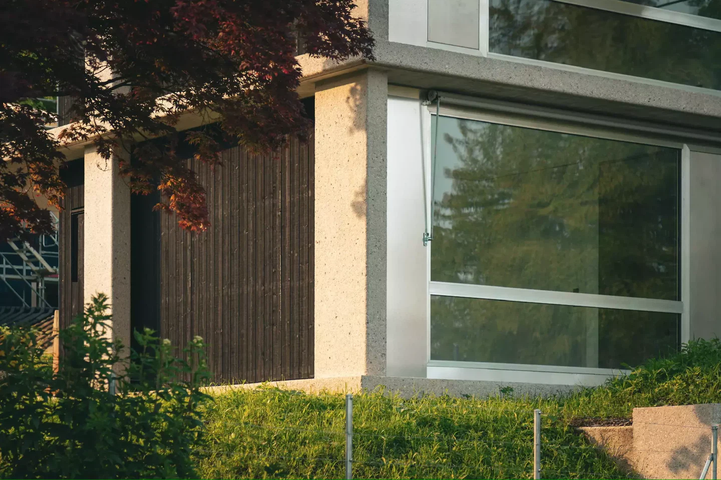Le sol Cleancrete, utilisé pour la première fois dans un bâtiment avec chauffage au sol, renonce entièrement au ciment. Cleancrete repose également sur des granulats recyclés, réduisant ainsi l’empreinte CO₂. Dans la cuisine, un ponçage révèle une structure granulaire en terrazzo, offrant une sensation agréable sous les pieds nus. La façade suit une logique bioclimatique: de larges fenêtres pour la ventilation transversale et la vue sur la vallée côté pente, de généreuses surfaces vitrées pour les gains passifs d’énergie en hiver. Les auvents et les stores textiles à bras articulés évitent la surchauffe estivale. L’eau de pluie est collectée, le photovoltaïque alimente la pompe à chaleur, et le toit végétalisé avec un petit sauna interprète de manière contemporaine le principe du jardin sur le toit.