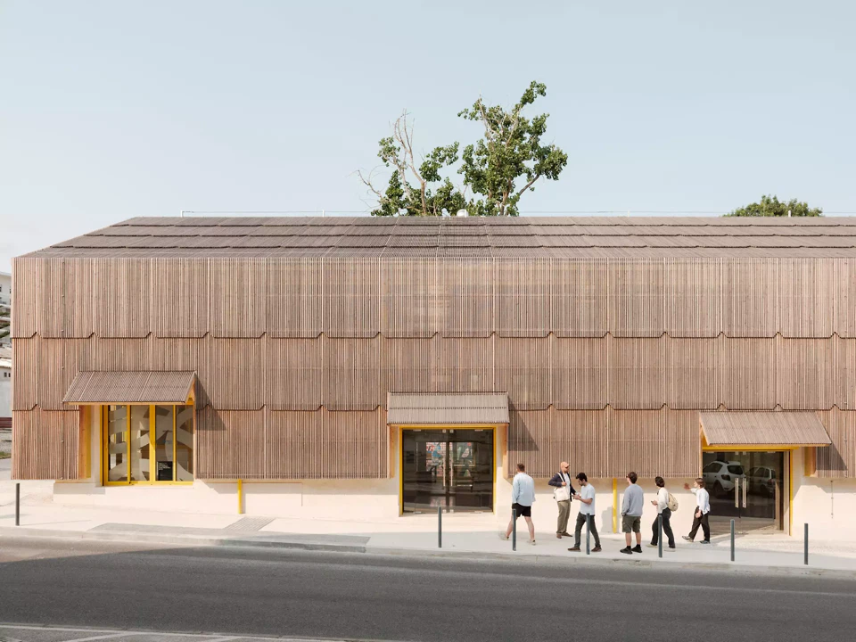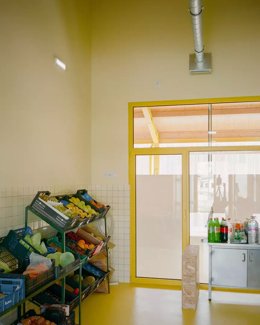Les cahiers des charges du projet prévoyaient l'hébergement de tous les commerçants existants, ce qui a donné lieu à un processus participatif fondé sur des entretiens, des analyses et des présentations au sein de la communauté. Cet engagement a façonné le concept: les murs porteurs existants ont été conservés, tandis que des espaces polyvalents et des infrastructures ont été mis en place. Cette transformation a permis d’étendre le programme spatial vers le haut, le premier étage abritant des magasins s’ouvrant sur une terrasse. Là, des espaces extérieurs et des modules d’agriculture urbaine favorisent le dialogue entre la consommation et la production locale. Deux escaliers situés aux extrémités du bâtiment créent une boucle – un parcours continu reliant les deux étages. Parallèlement, la topographie en pente et une rampe sur la terrasse permettent d’accéder à tous les niveaux. La mise en valeur de la halle est renforcée par une toiture en bois surdimensionnée qui prolonge la géométrie de la structure d’origine. Elle soutient les volumes suspendus des magasins et définit une galerie le long de la terrasse. Côté sud, le porte-à-faux du toit forme un nouvel atrium pouvant accueillir des marchés temporaires, du street art et des événements communautaires.