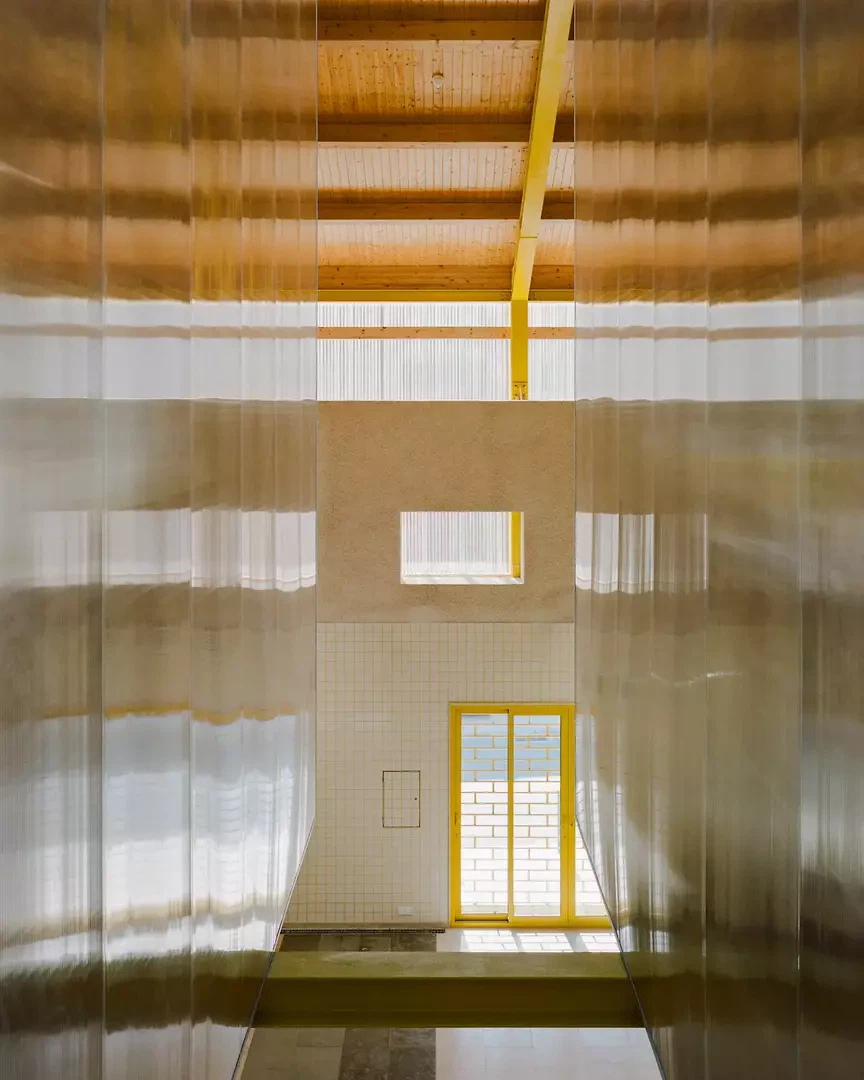 Le projet explore une dualité des matériaux entre la rénovation du bâtiment existant, avec des surfaces minérales locales, et une structure hybride en bois intégrant le toit et les parties supérieures des magasins. Les murs en pierre d'origine sont renforcés sur le plan statique par du béton projeté et revêtus d'un crépi grossier ainsi que de carreaux de céramique. Les sols et les plinthes sont recouverts de calcaire de Lioz provenant de la région. Le nouveau toit, composé de charpentes en acier peintes en jaune qui enjambent de grandes portées et sont renforcées par des pannes en bois, supporte les volumes suspendus des magasins et permet ainsi une utilisation flexible du rez-de-chaussée en tant que halle de marché. Cette stratégie hybride allie efficacité structurelle et durabilité écologique et économique. Du bois traité thermiquement sous forme de lamelles assure la protection solaire, tandis que des panneaux en polycarbonate recyclables revêtent la façade intérieure et garantissent une protection contre les intempéries ainsi qu’un entretien aisé. Ces éléments forment un système de double façade qui permet une ventilation naturelle et laisse passer la lumière du jour filtrée, rappelant ainsi les principes traditionnels des marchés.