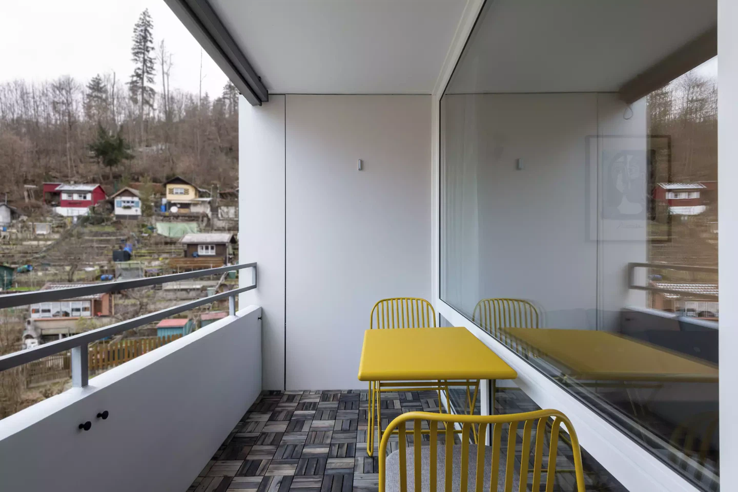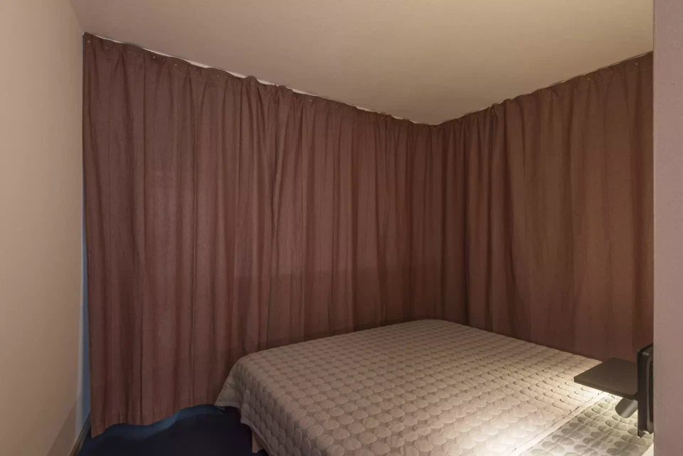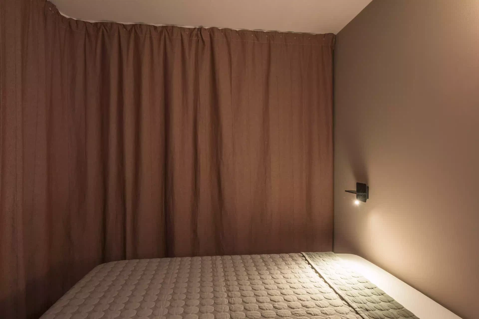 L'entrée sert de vestiaire et d'espace de rangement, d'où l'on accède à la chambre à coucher avec salle de bains attenante, espace de rangement supplémentaire et coin bureau intégré. Un refuge privé qui peut être adapté selon les besoins, car un rideau servant de cloison mobile permet une utilisation flexible et crée un sentiment de sécurité. La cuisine ouverte, qui constitue le cœur de l'appartement, se fond harmonieusement dans le salon et la salle à manger, qui s'ouvrent sur la nature environnante grâce à une grande fenêtre donnant sur le balcon.