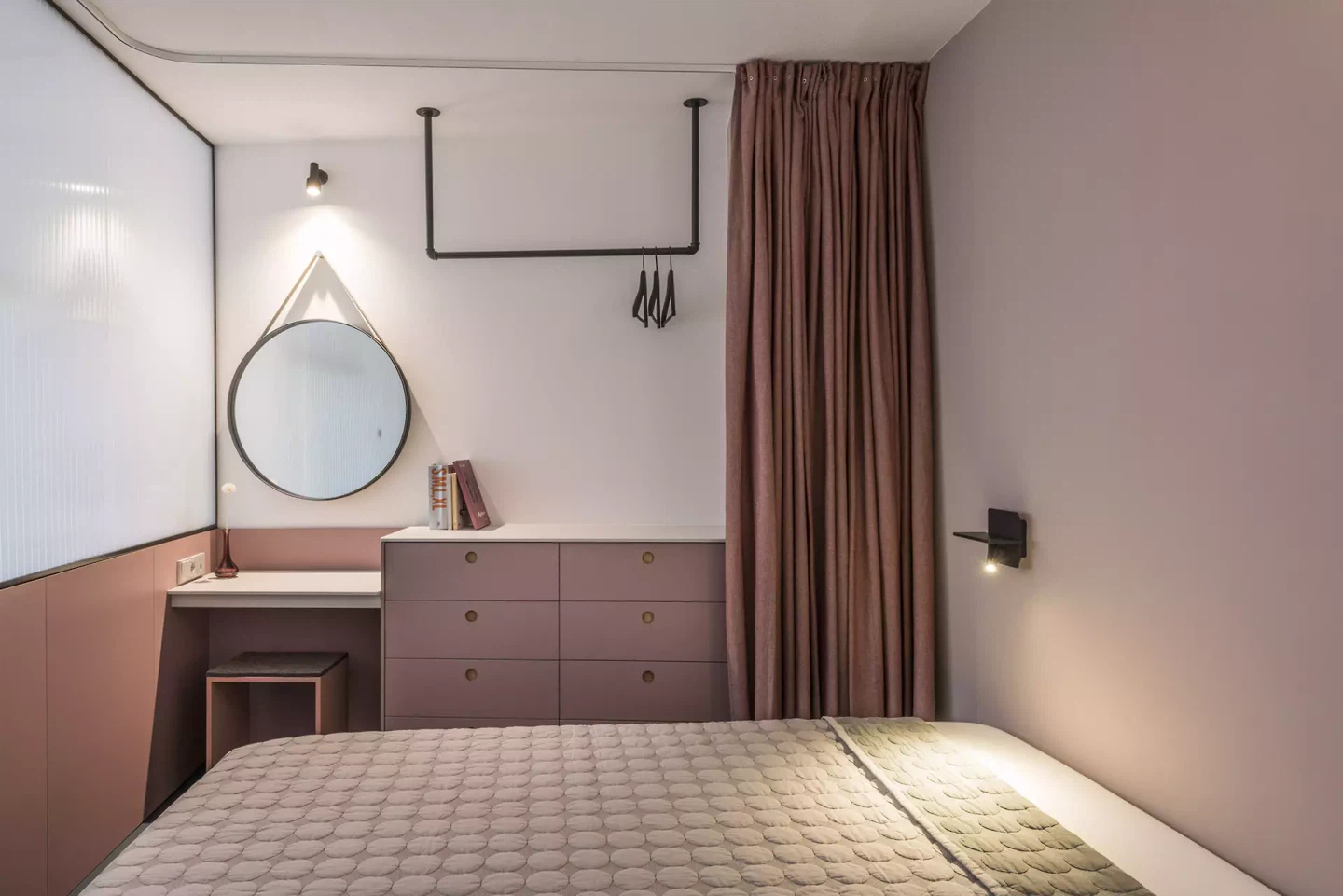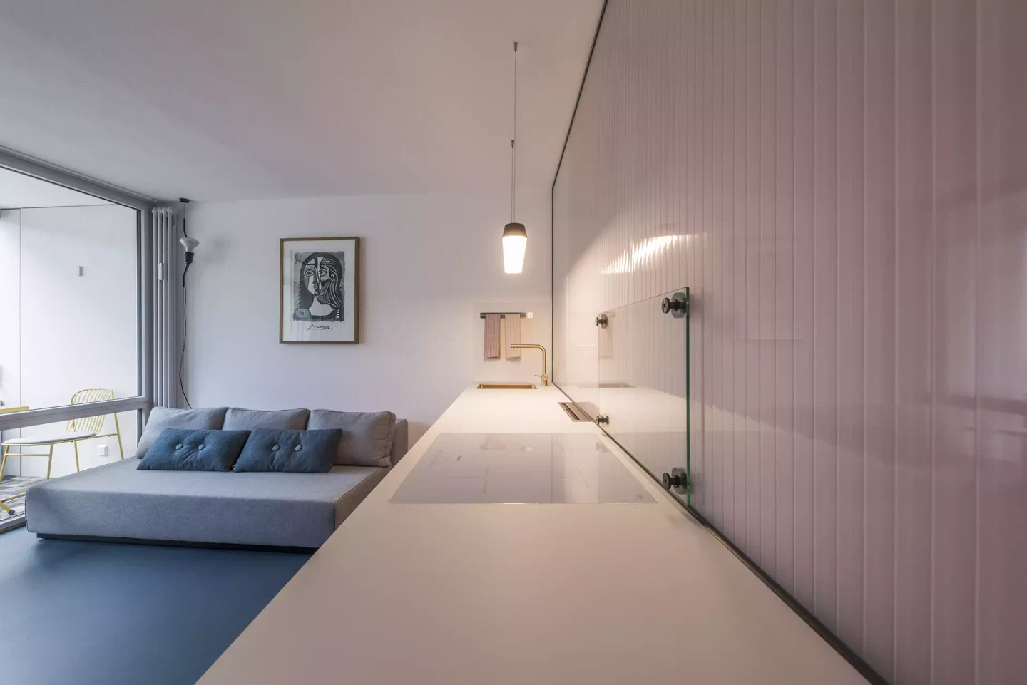 Un autre défi consistait à rendre l'appartement confortable et ordonné. Pour ce faire, nous avons développé une palette de matériaux et de couleurs harmonieuse qui renforce la continuité visuelle et donne l'impression d'un espace plus grand et plus harmonieux. Un éclairage intelligent, des surfaces réfléchissantes et un mobilier soigneusement sélectionné ont également contribué à créer une sensation d'ouverture.