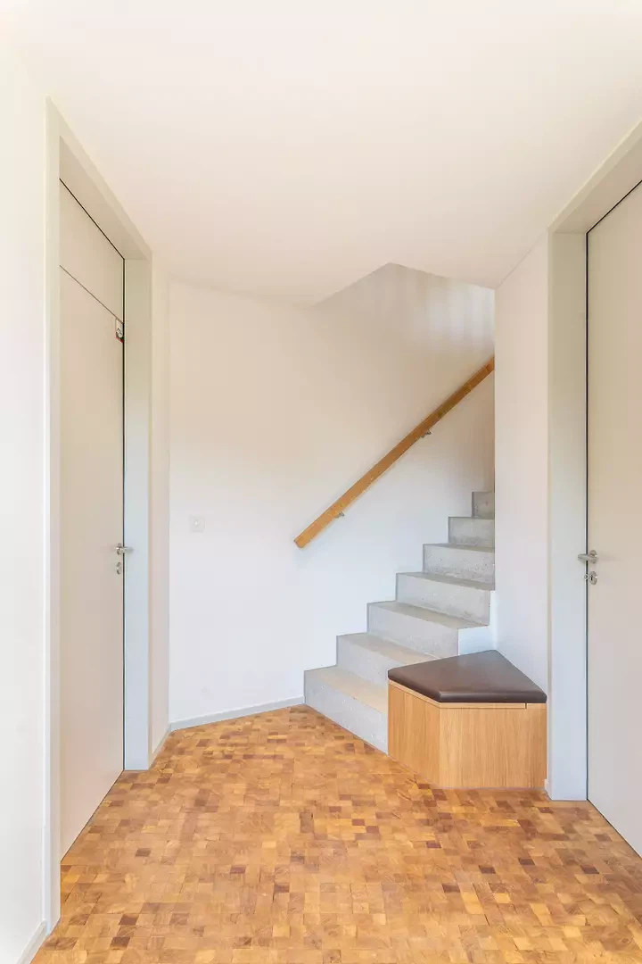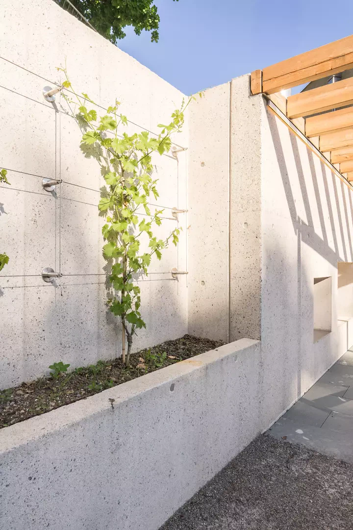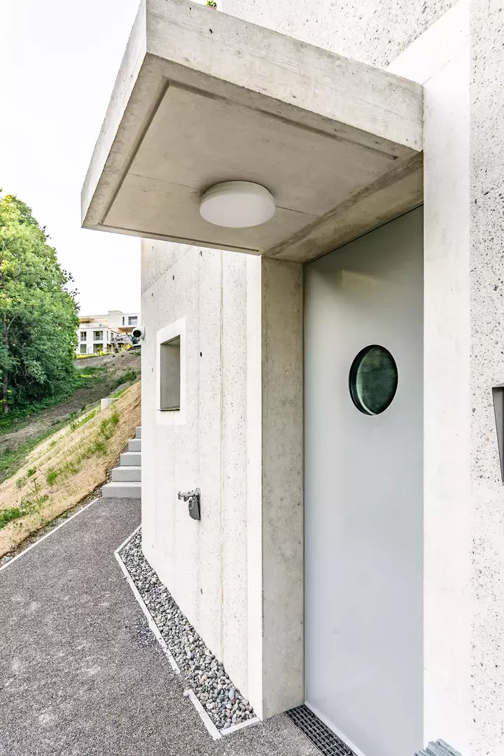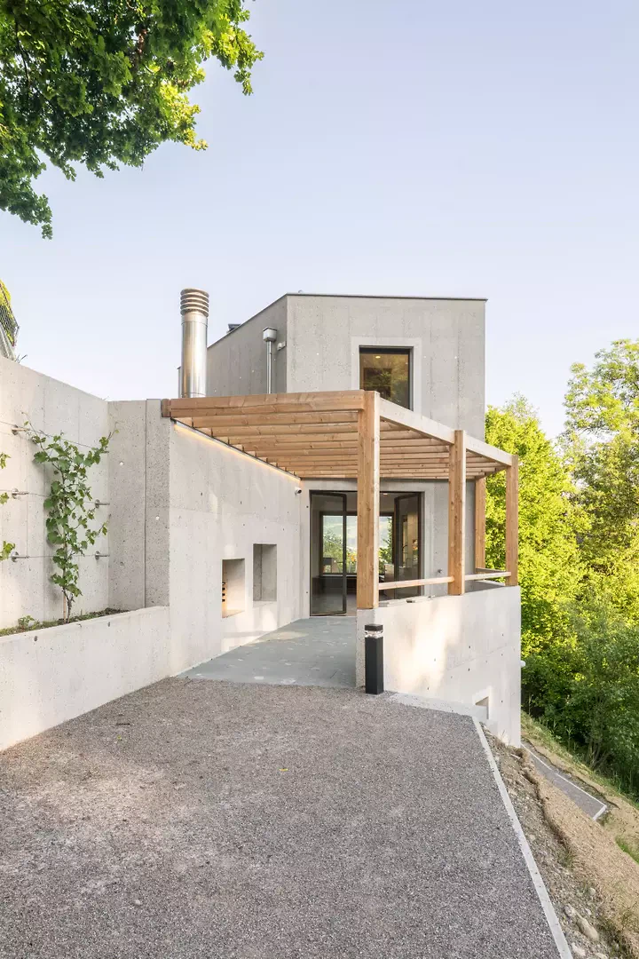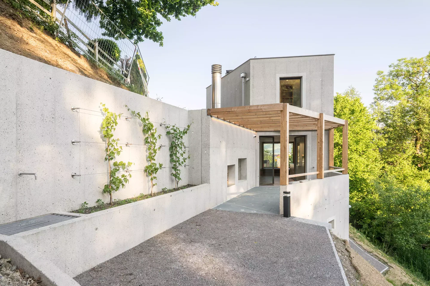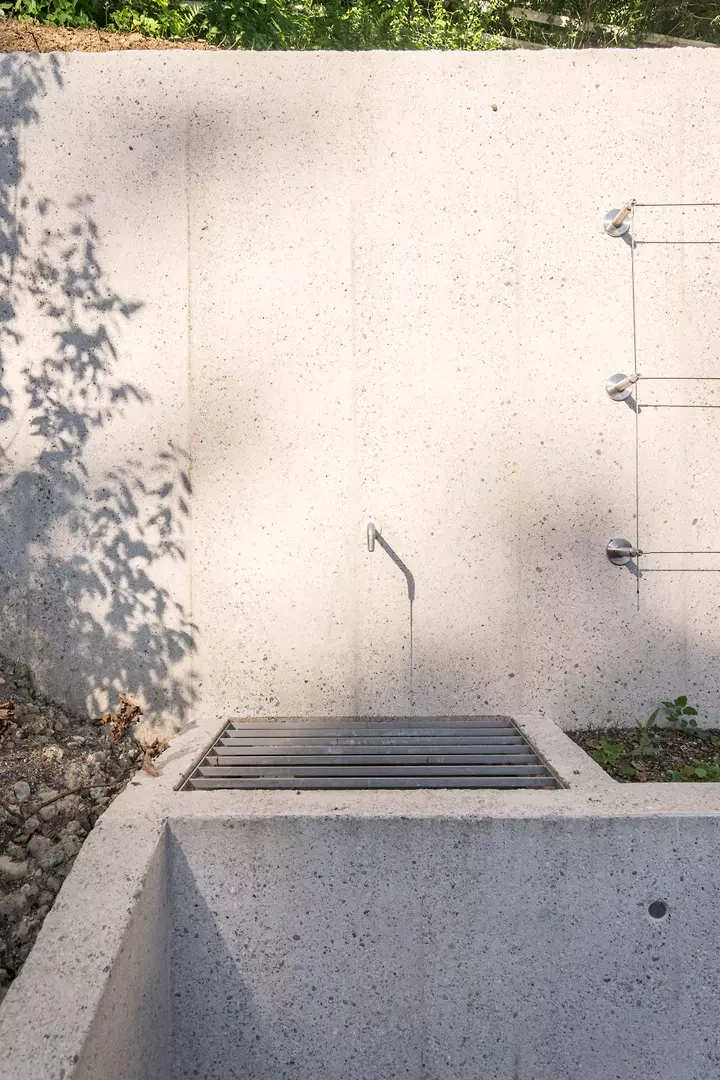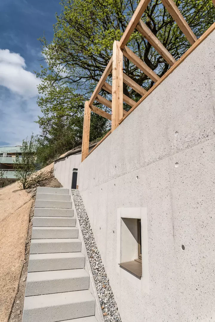 La structure compacte repose sur une structure en béton massif solidement ancrée dans la pente raide. La façade est en béton bouchardé de couleur claire. À l'intérieur, quelques matériaux choisis avec précision caractérisent l'espace : parquet en bois de chêne, enduit à la chaux lissé à grain fin et éléments encastrés en acier inoxydable et en bois massif. La cuisine et les salles d'eau sont organisées de manière fonctionnelle et équipées de revêtements en céramique et d'appareils robustes. La cage d'escalier est en béton blanc poli. À l'extérieur, des dalles en pierre naturelle, une pergola en bois de mélèze et une petite fontaine d'eau de source intégrée dans un mur de soutènement complètent l'ensemble.