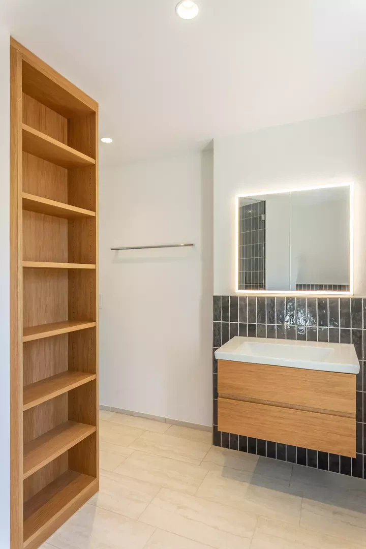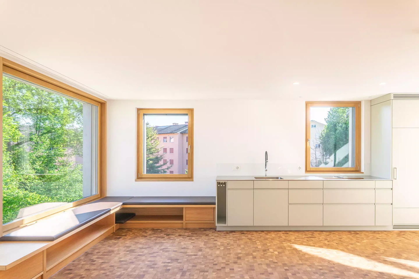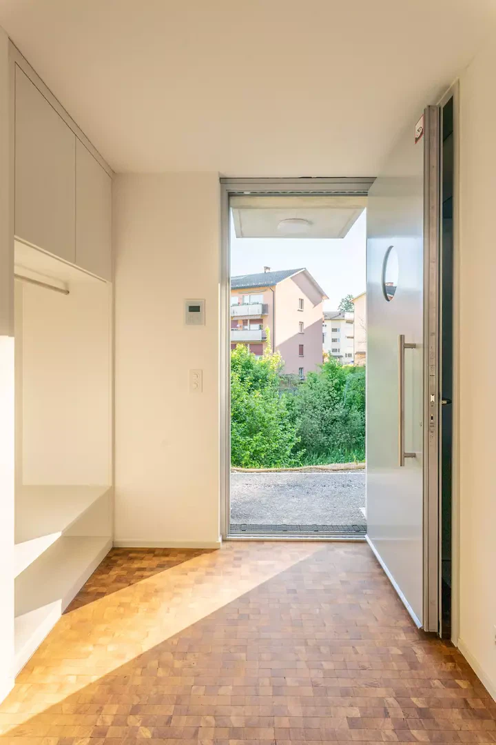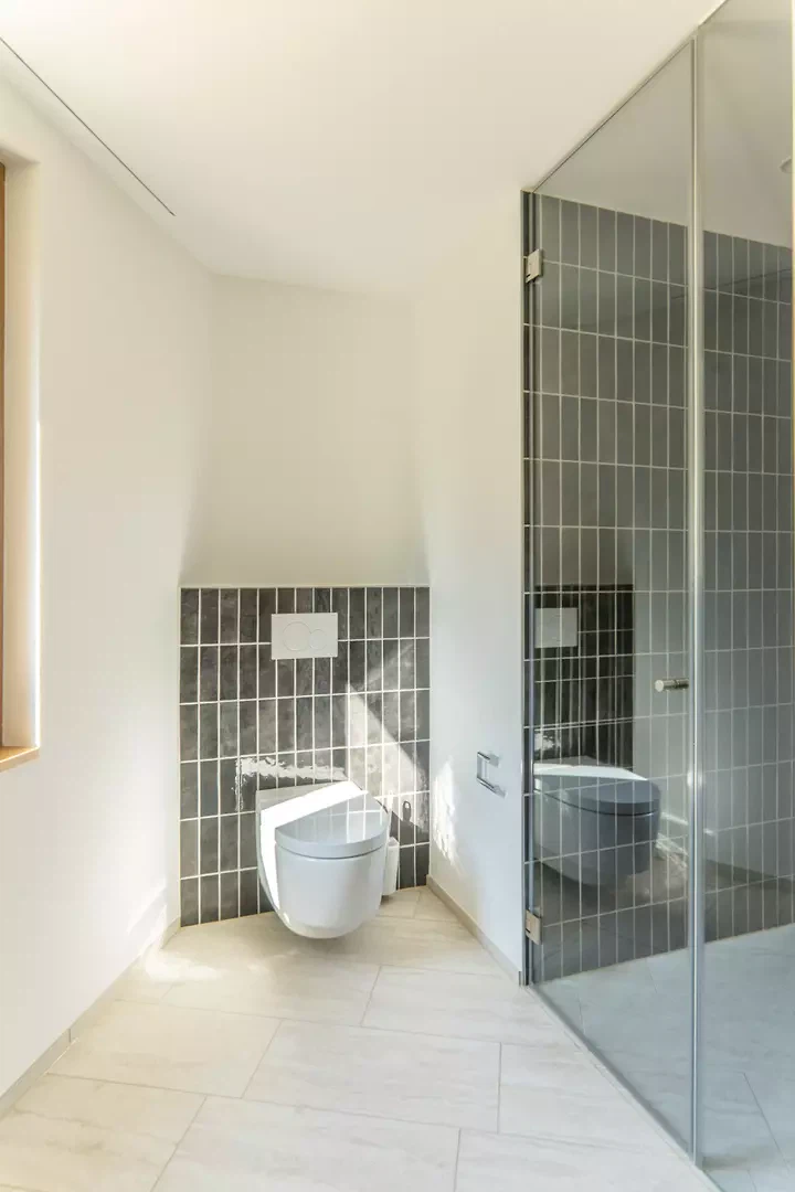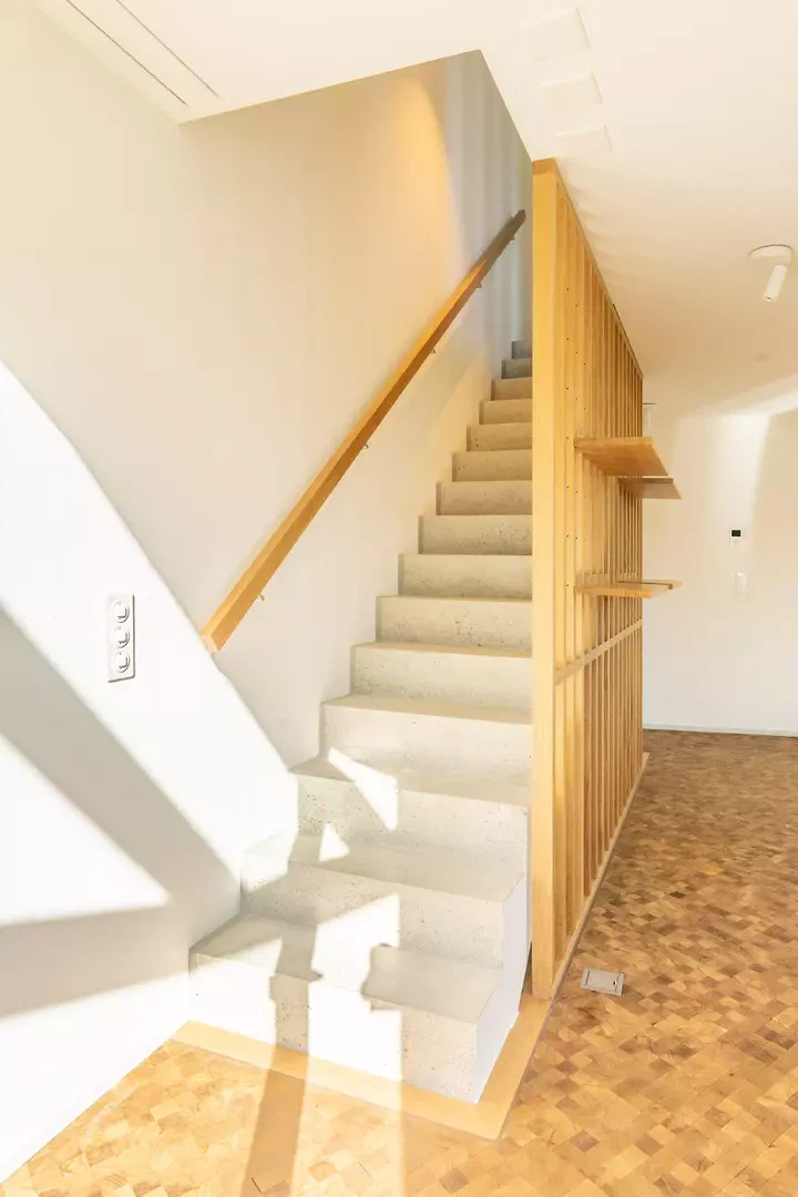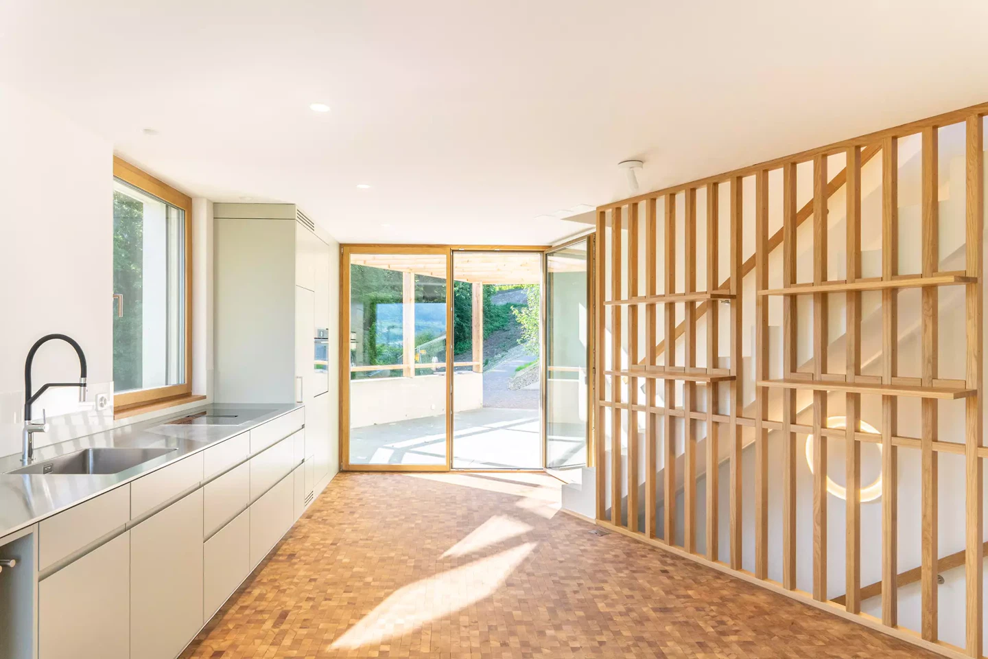La structure compacte repose sur une structure en béton massif solidement ancrée dans la pente raide. La façade est en béton bouchardé de couleur claire. À l'intérieur, quelques matériaux choisis avec précision caractérisent l'espace : parquet en bois de chêne, enduit à la chaux lissé à grain fin et éléments encastrés en acier inoxydable et en bois massif. La cuisine et les salles d'eau sont organisées de manière fonctionnelle et équipées de revêtements en céramique et d'appareils robustes. La cage d'escalier est en béton blanc poli. À l'extérieur, des dalles en pierre naturelle, une pergola en bois de mélèze et une petite fontaine d'eau de source intégrée dans un mur de soutènement complètent l'ensemble.