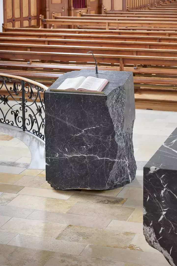 Ambo: L’ambo est le lieu surélevé d’où sont lues la lecture biblique ou l’Évangile. Cette «montée» trouve son explication dans une parole du prophète Isaïe: «Monte sur une haute montagne, Sion, messagère de la joie» (Is 40,9). On monte à l’ambon surélevé pour annoncer aux hommes la venue du Sauveur. Une pierre peut donc très bien symboliser l’origine de l’ambon.Fonts baptismaux: comme les fonts baptismaux devaient être placés à l'avant de l'église et qu'ils seraient ainsi en lien visuel étroit avec l'autel et l'ambon, l'équipe de Frédéric Dedelley a proposé de les redessiner également. Les premiers fonts baptismaux autonomes connus sont des monolithes posés au sol, souvent décorés avec art de reliefs, d’ornements ou de figurines. Dans cette conception, la surface brute de la pierre reprend le rôle des ornements des fonts baptismaux historiques.