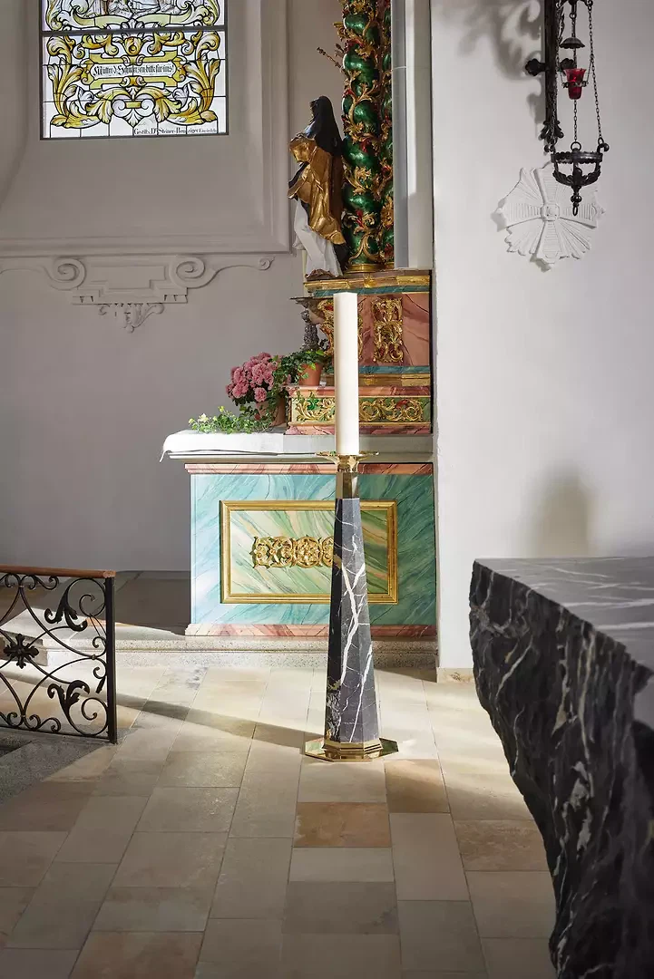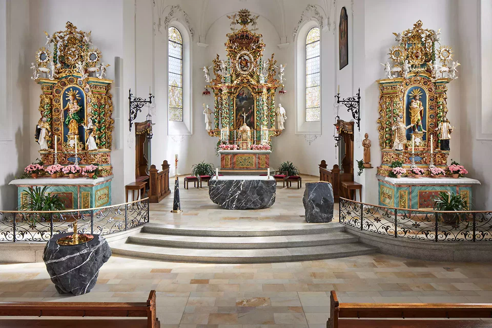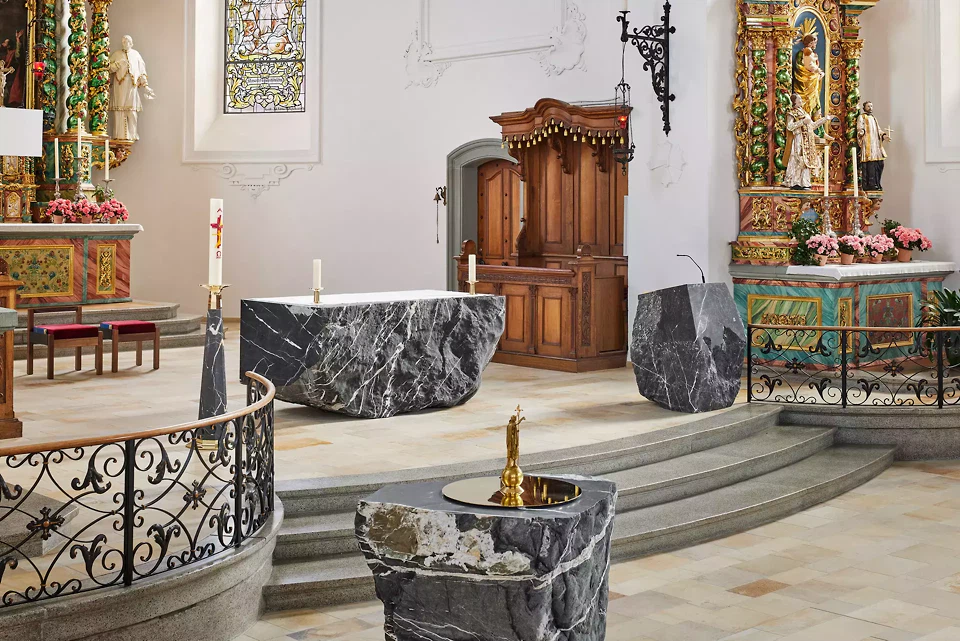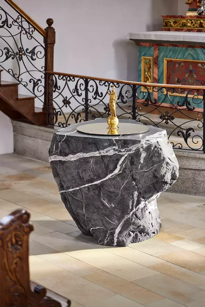 Autel: en référence au rocher sur lequel le Christ a bâti son Église (1 Co 10,4), les autels sont souvent conçus depuis le Moyen Âge comme des blocs monolithiques en pierre naturelle. Pour le nouvel autel, les auteurs se sont inspirés de cette tradition et ont réinterprété cette typologie en la combinant avec les principes de conception baroques.