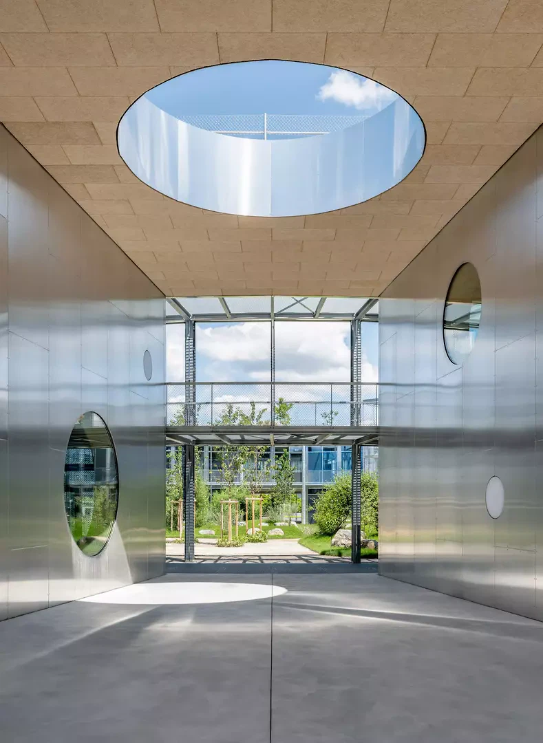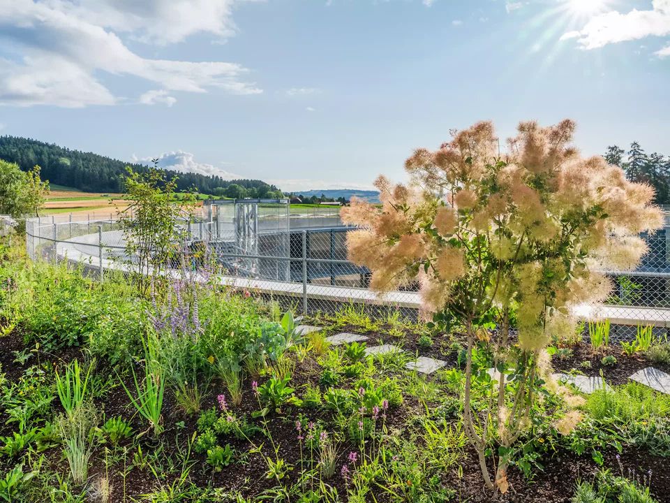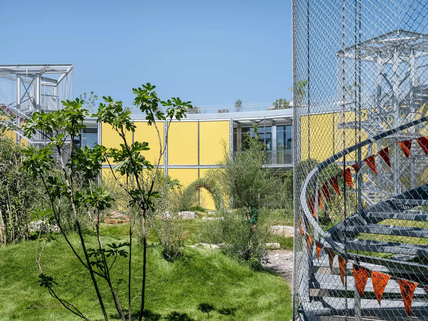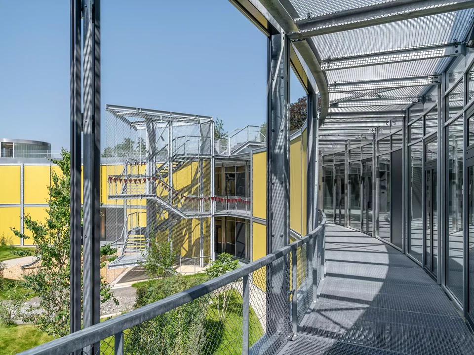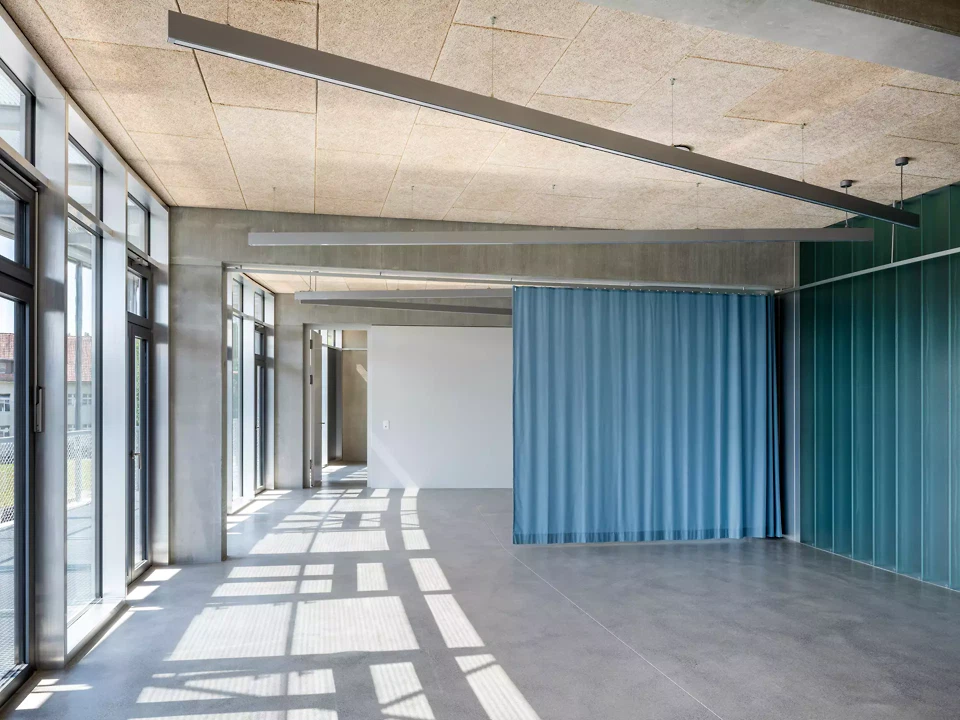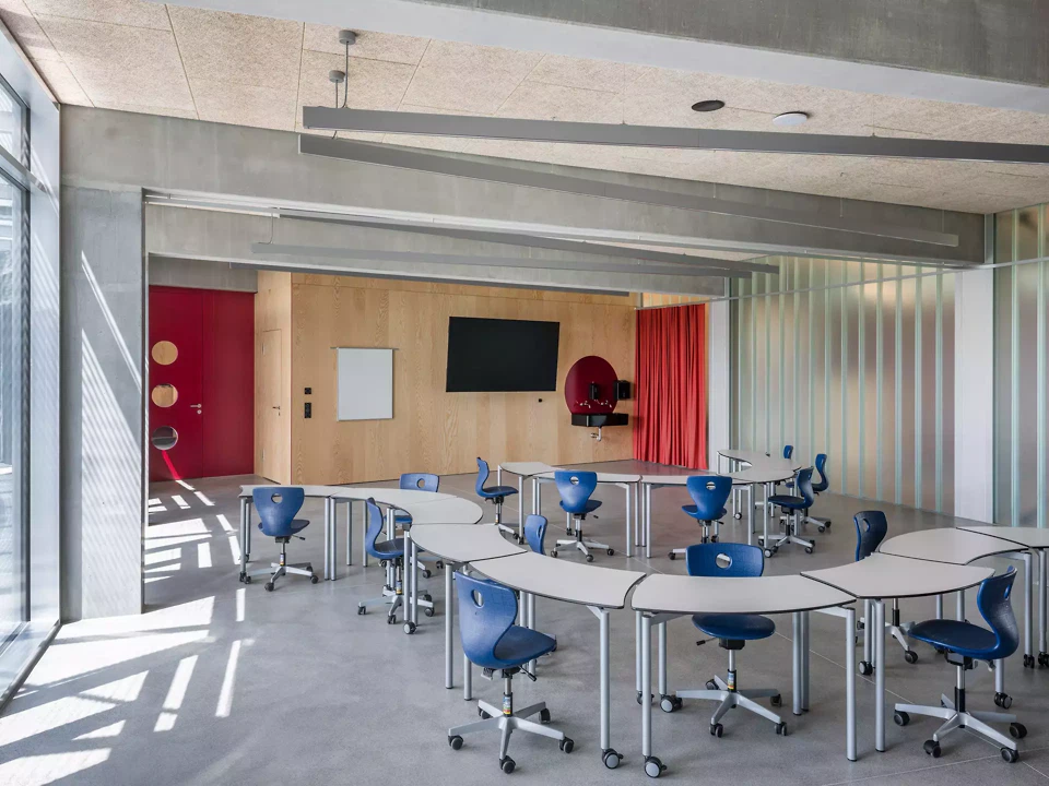 La topographie en pente douce du terrain était essentielle pour nous; nous l’avons mise à profit pour créer des entrées aux trois niveaux de l’école et ainsi intégrer celle-ci à son environnement. Le quatrième niveau de l'école est le jardin commun sur le toit, qui offre une vue sur la légère colline et l'étendue du paysage. L'école voisine existante a dû rester en service pendant toute la phase de construction et abrite désormais les ateliers créatifs au sein du complexe global.