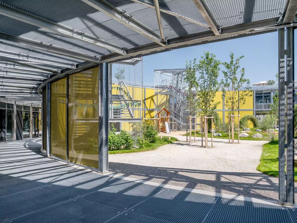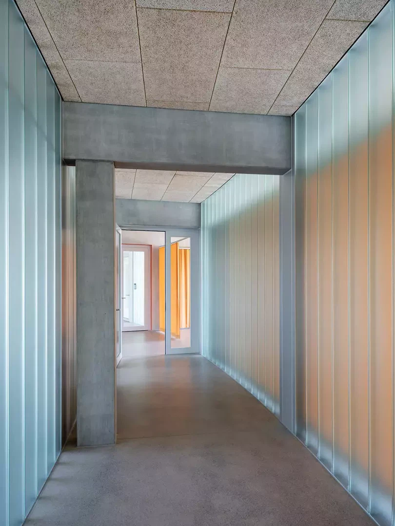 Le thème principal des espaces intérieurs réside dans la forte présence des matériaux eux-mêmes: bois, béton, métal, verre – complétés par des textiles colorés. À l'extérieur, la tonnelle en acier avec protection solaire textile intégrée marque considérablement l'apparence du bâtiment.