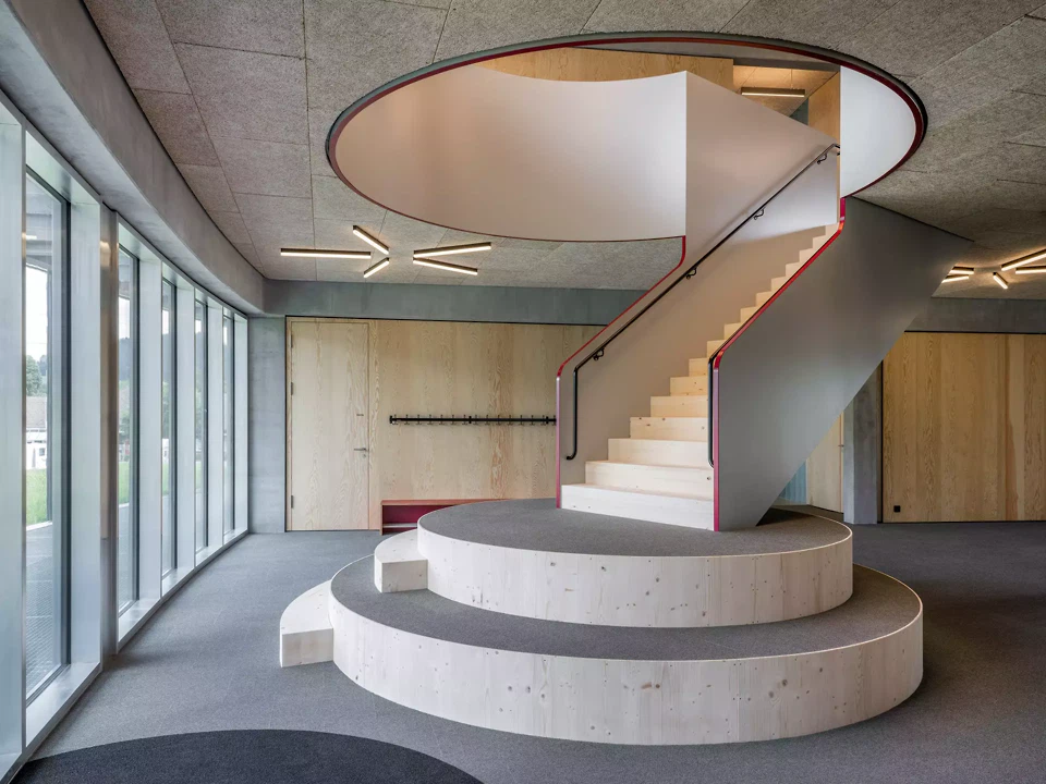 Le complexe scolaire de Stalden s'intègre à la topographie caractéristique du site et se présente sous la forme d'un bâtiment à un étage le long de la Hübelistrasse, à deux étages dans la cour et à trois étages le long de la Thunstrasse. À tous les niveaux, des accès directs permettent de rejoindre les trois pôles scolaires indépendants, comprenant chacun huit salles de classe, ainsi que le pôle commun avec la salle de réunion et la garderie. Ces quatre « maisons » sont reliées entre elles par deux arcades et une toiture commune. Côté cour, les maisons se présentent avec quatre tours d’escalier aux formes géométriques variées, qui mènent de la cour jusqu’à la terrasse sur le toit. Ces formes, associées à la palette de couleurs propre à chaque maison, facilitent l’orientation et permettent de distinguer clairement chaque bâtiment au sein du complexe scolaire. À l'intérieur, tous les clusters sont organisés autour d'un hall d'escalier central et occupent chacun un segment circulaire de l'ensemble scolaire. Un escalier sculptural, conçu architecturalement comme un meuble et pouvant servir de cercle de discussion, relie les deux étages. L'ensemble du bâtiment est de conception modulaire. Les éléments porteurs se composent de poteaux en béton préfabriqués et de poutres s'étendant sur toute la profondeur du bâtiment. Le renforcement antisismique est assuré par des murs radiaux en béton apparent entre les segments. Tous les murs, escaliers et aménagements sont des éléments amovibles, ce qui permet une certaine flexibilité pour les développements futurs. Les matériaux utilisés à l'intérieur soulignent le caractère d'atelier de l'espace d'apprentissage.