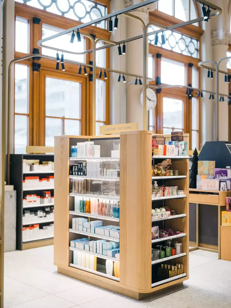 La pharmacie Amavita de la gare centrale de Zurich réintègre, après 3,5 ans d’exploitation provisoire, ses locaux fraîchement rénovés, vieux de près de 150 ans. Mandaté par Galenicare et Amavita, le projet développe, en collaboration avec B-M-K GmbH, une nouvelle expérience pharmaceutique remarquable. Le mobilier de vente haut de gamme, caractérisé par une esthétique matérielle chaleureuse et inspirée de la nature, s’intègre harmonieusement dans l’impressionnante halle des pas perdus classée du bâtiment sud et crée une atmosphère spatiale accueillante.