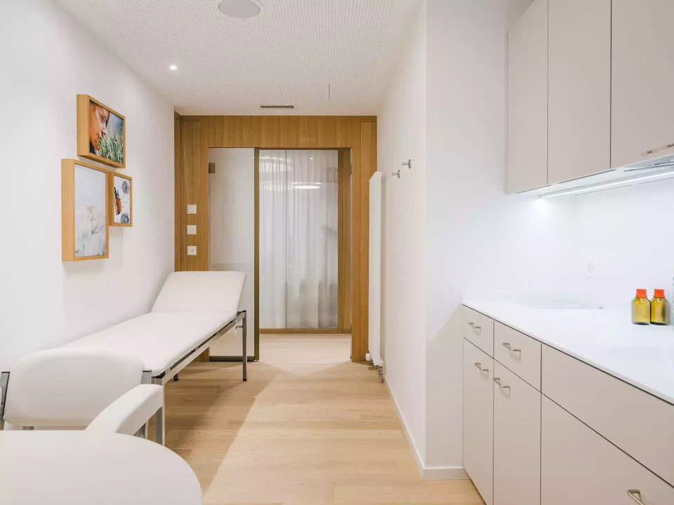Au 3e étage du bâtiment, environ 300 mètres carrés supplémentaires accueillent les espaces de back-office de la pharmacie. Afin de créer une atmosphère chaleureuse et confortable, le bois de chêne y est également utilisé comme matériau central, tandis que, dans la partie ancienne du bâtiment, les couleurs et les matériaux sont délibérément adaptés à la substance existante protégée.
