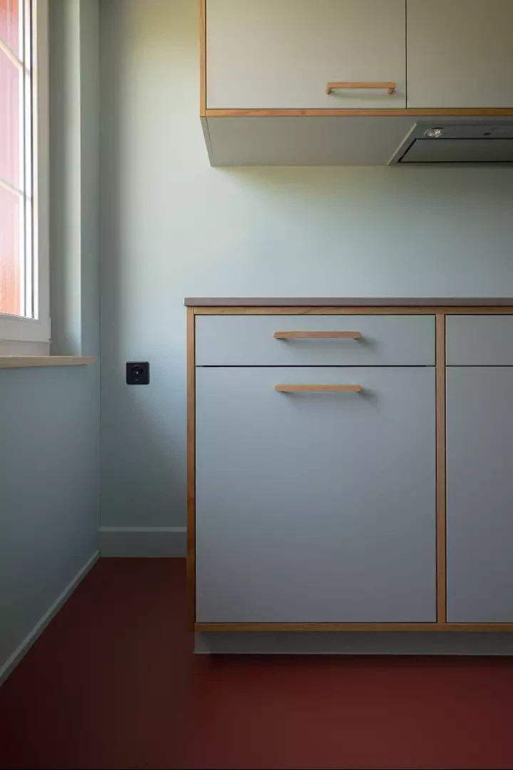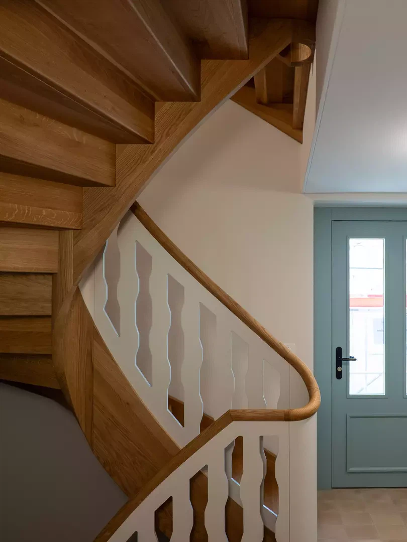 L’intervention structurellement la plus importante consiste en le remplacement de l’escalier du XIXe siècle. En concertation avec les services de protection du patrimoine et dans une perspective à long terme du bâtiment, cette démarche a pu être argumentée. L’idée centrale pour nous résidait dans le fait de ne pas simplement suivre la tendance actuelle du réemploi, mais de nous appuyer sur la compréhension de l’histoire de cette robuste maison à colombages pour nous accorder des libertés de conception aujourd’hui particulièrement pertinentes. Ainsi, dans l’ancien cabinet d’étude, le panneau de rideau plaqué des années 1970 rencontre la fenêtre des années 1990 avec son nouveau rebord, réunis par une palette chromatique historique. Simplement parce que c’est encore bon.