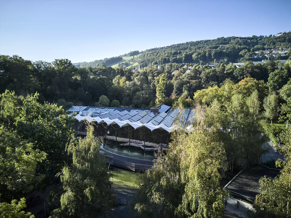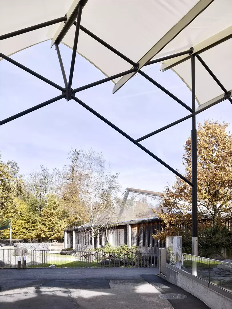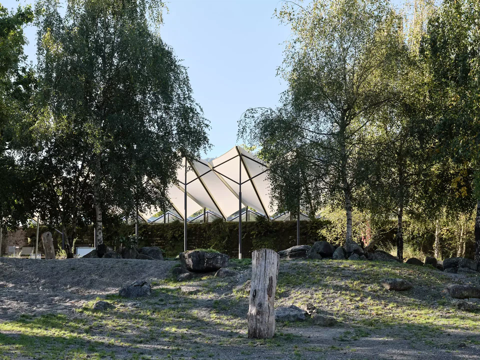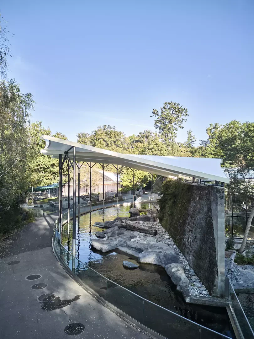 Grâce à son nouveau toit en voile plissé et au paysage de fjord qui s'étend en contrebas, l'enclos des phoques du zoo de Berne entre dans une nouvelle phase d'exploitation. Malgré la présence d'une toiture, l'atmosphère extérieure a pu être préservée, voire renforcée par l'aménagement naturel du paysage rocheux. L'enclos a été nettement valorisé sans travaux de démolition importants, ce qui a permis d'améliorer le bien-être des animaux et d'enrichir l'expérience des visiteurs tant sur le plan spatial que climatique. La rénovation complète du bassin des phoques a été réalisée sous la direction générale de Weber + Brönnimann Landschaftsarchitekten AG, qui a également conçu le réaménagement du bassin avec le paysage de fjord. Le système d'ombrage a été développé par le consortium HuberHutmacher (Sonja Huber Architektur et Carol Hutmacher Architektur).