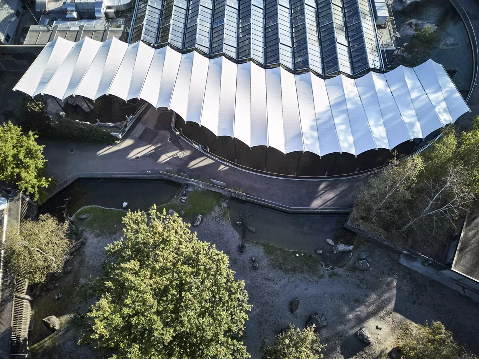 Un joint parfaitement ajusté entre la structure existante et la nouvelle toiture garantit le même niveau de perméabilité à l'eau de pluie, qui s'écoule ensuite le long du mur. À la place de la structure en verre et en acier du vivarium, le nouveau système d'ombrage repose sur une structure en acier recouverte d'une membrane. Côté salle des visiteurs, le toit s'élève légèrement afin de créer une impression d'espace. Une poutre sur deux présente une pente plus prononcée, ce qui entraîne une torsion du plissé du toit, ou plutôt un renversement horizontal. Cette torsion permet de tendre correctement les bandes de toile.