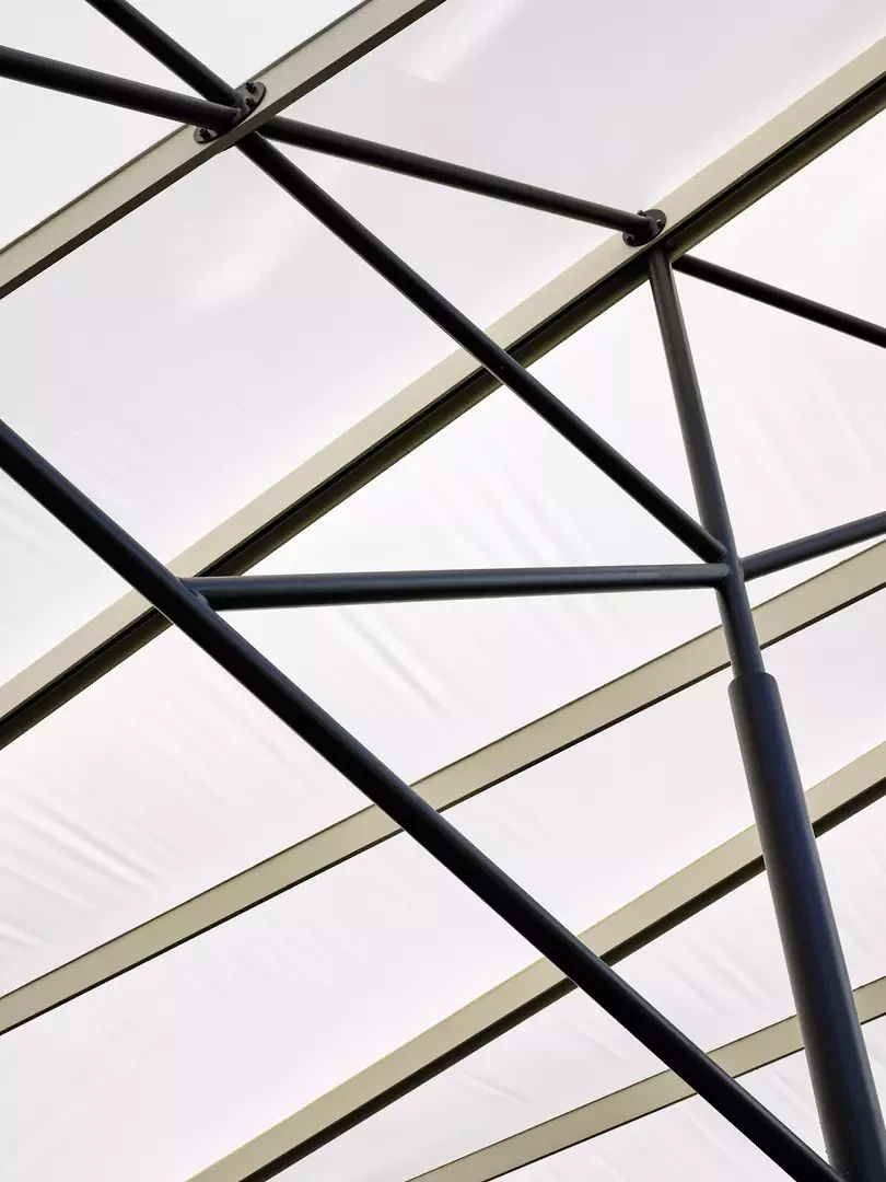 L'installation spécifique de la membrane, qui privilégie une tension torsadée plutôt qu'une tension plane, a largement contribué à la conception du système d'ombrage.