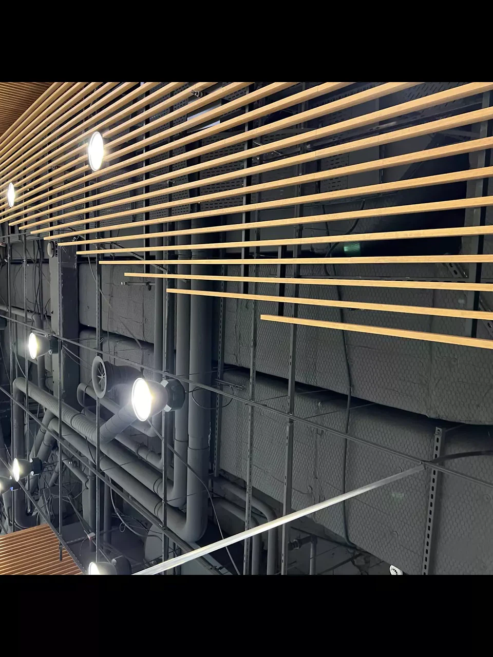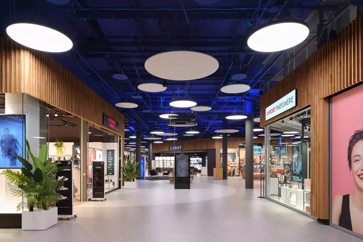 Le revêtement mural des vitrines commerciales en bois de chêne, déjà réalisé lors d’un précédent rafraîchissement dans la partie Est, est conservé en raison de sa durabilité, de son bon état et de son esthétique contemporaine. Dans un souci d’unité, ce revêtement est étendu à l’ensemble du centre commercial. À l’instar de la partie Est, le faux plafond acoustique suspendu en plâtre est supprimé dans la partie Ouest, afin de révéler la généreuse hauteur sous plafond. Tous les éléments de plafond en bon état sont intégrés dans un catalogue de composants et restent ainsi dans le cycle de vie. Le plafond et toutes les installations situées à ce niveau sont peints dans la couleur « ultramarin », évoquant le ciel et visant à créer une grande profondeur. Le plafond est équipé de luminaires circulaires (LED) diffusant une lumière diffuse, en partie indirecte, qui génère une grande qualité de séjour. Afin d’obtenir un effet de lumière du jour agréable et stimulant, accompagné de jeux d’ombre, des luminaires à éclairage direct sont également installés au-dessus des surfaces d’exposition locatives. L’acoustique des espaces est améliorée grâce à des panneaux acoustiques circulaires en PET recyclé (upcycling), qui répondent aux différentes ambiances spatiales. Ces éléments sont disposés à différents niveaux par rapport aux luminaires, renforçant ainsi l’effet de profondeur et l’analogie avec le ciel.