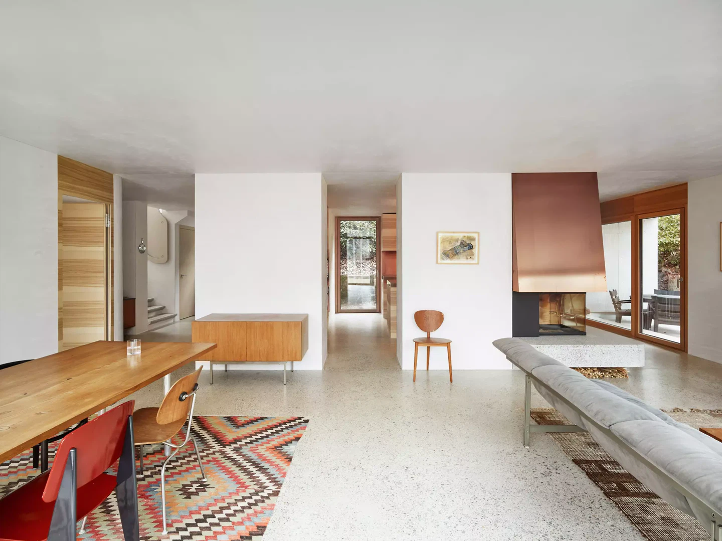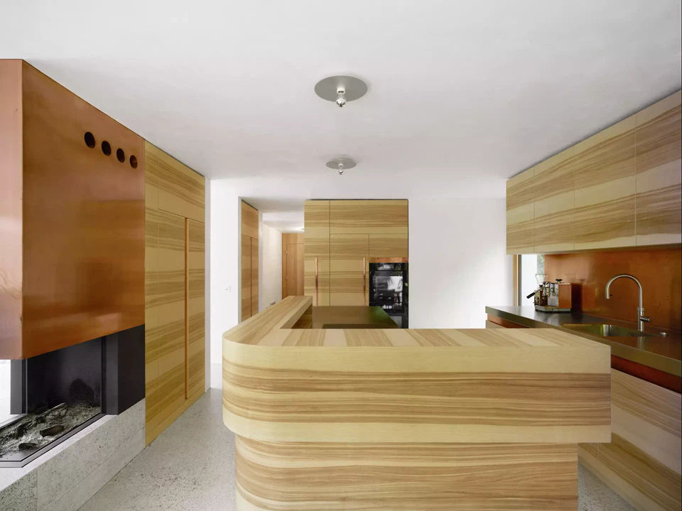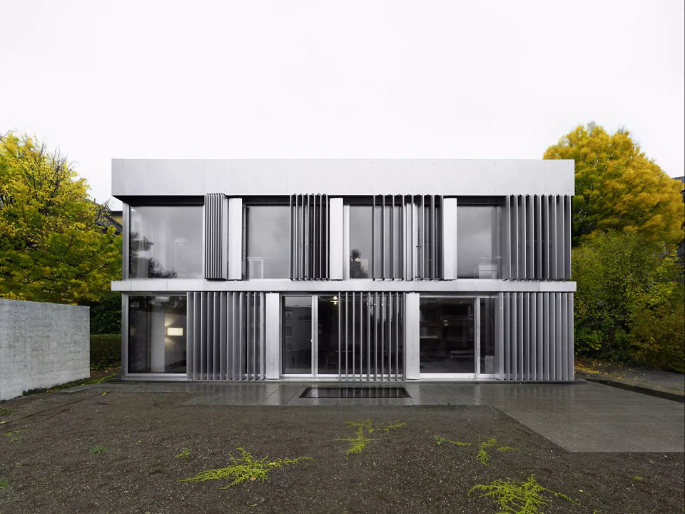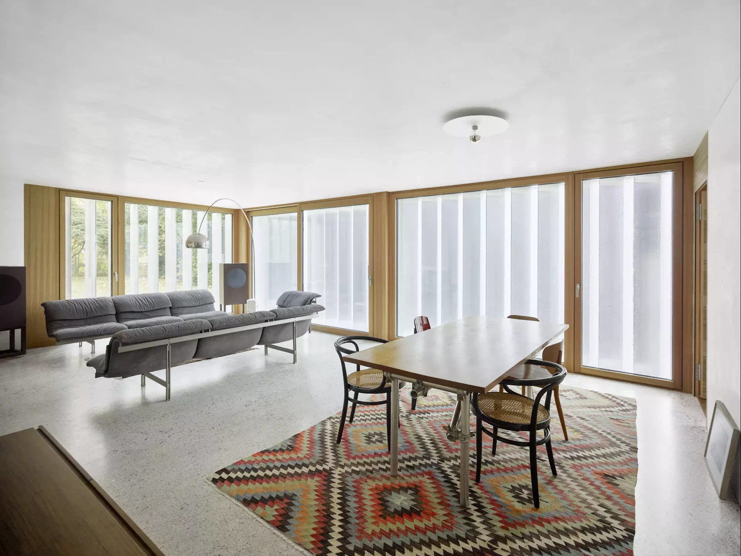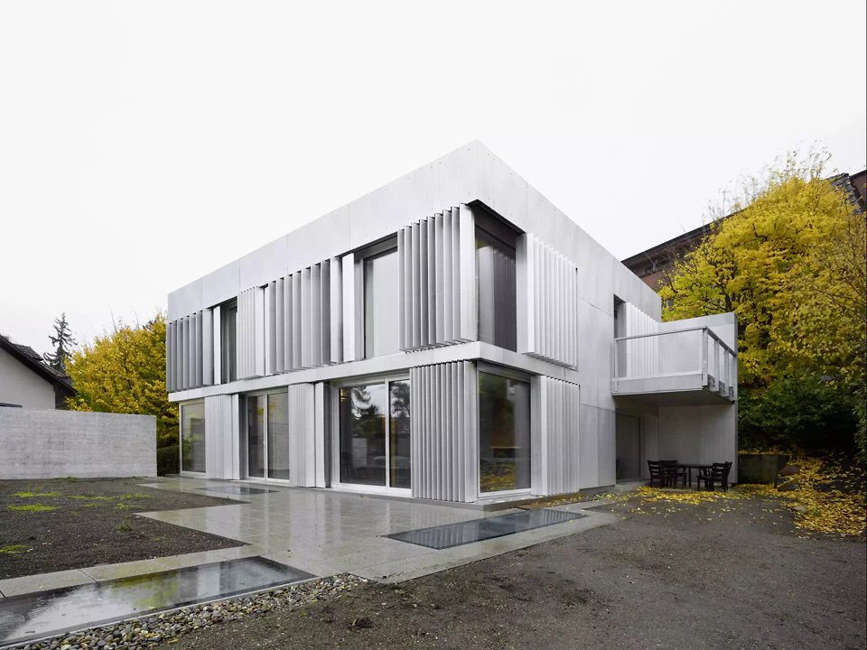 La maison individuelle existante, de deux étages avec garage souterrain, est située dans un quartier résidentiel verdoyant du Zürichberg et a d’abord été occupée par le maître d’ouvrage avec sa première famille. Construite en 1964 par l’architecte zurichois Edwin Schoch dans le cadre d’un ensemble immobilier, elle est considérée comme un témoignage de l’architecture moderne d’après-guerre en matière de maisons individuelles. Le projet de transformation comprend l'agrandissement du volume du bâtiment en surface de 80 centimètres vers le sud, ce qui a permis d'aménager quatre chambres à l'étage supérieur au lieu de trois auparavant. Cela a permis de répondre aux besoins d'une famille recomposée de cinq personnes en leur offrant un foyer au caractère spécifiquement adapté à leurs besoins. Le projet de transformation comprend l'agrandissement du volume du bâtiment en surface de 80 cm vers le sud, ce qui a permis d'aménager quatre chambres à l'étage supérieur au lieu de trois auparavant. Cela a permis de répondre aux besoins d'une famille recomposée de cinq personnes en leur offrant un foyer au caractère spécifiquement adapté à leurs besoins. De plus, une extension souterraine a été créée pour la nouvelle occupante, l’artiste internationale Rachel Khedoori, afin d’accueillir un atelier spacieux, et une rénovation énergétique a été mise en œuvre grâce à une pompe à chaleur géothermique avec système de refroidissement naturel.