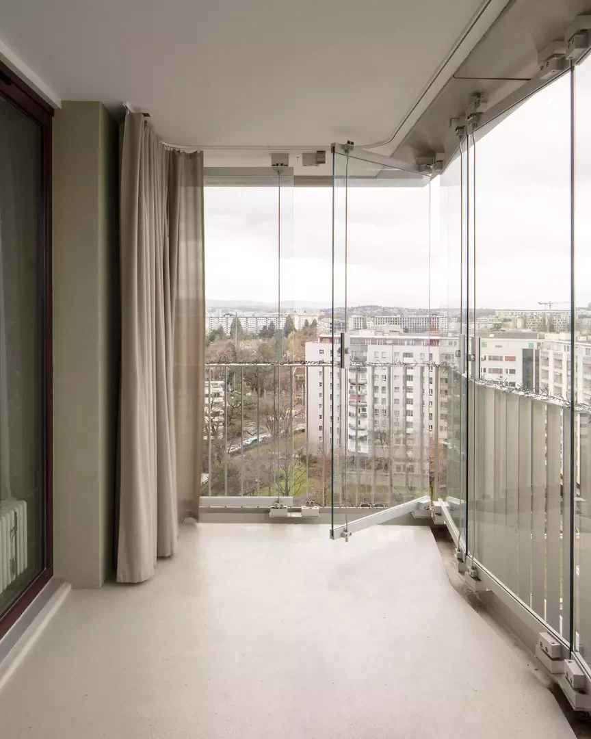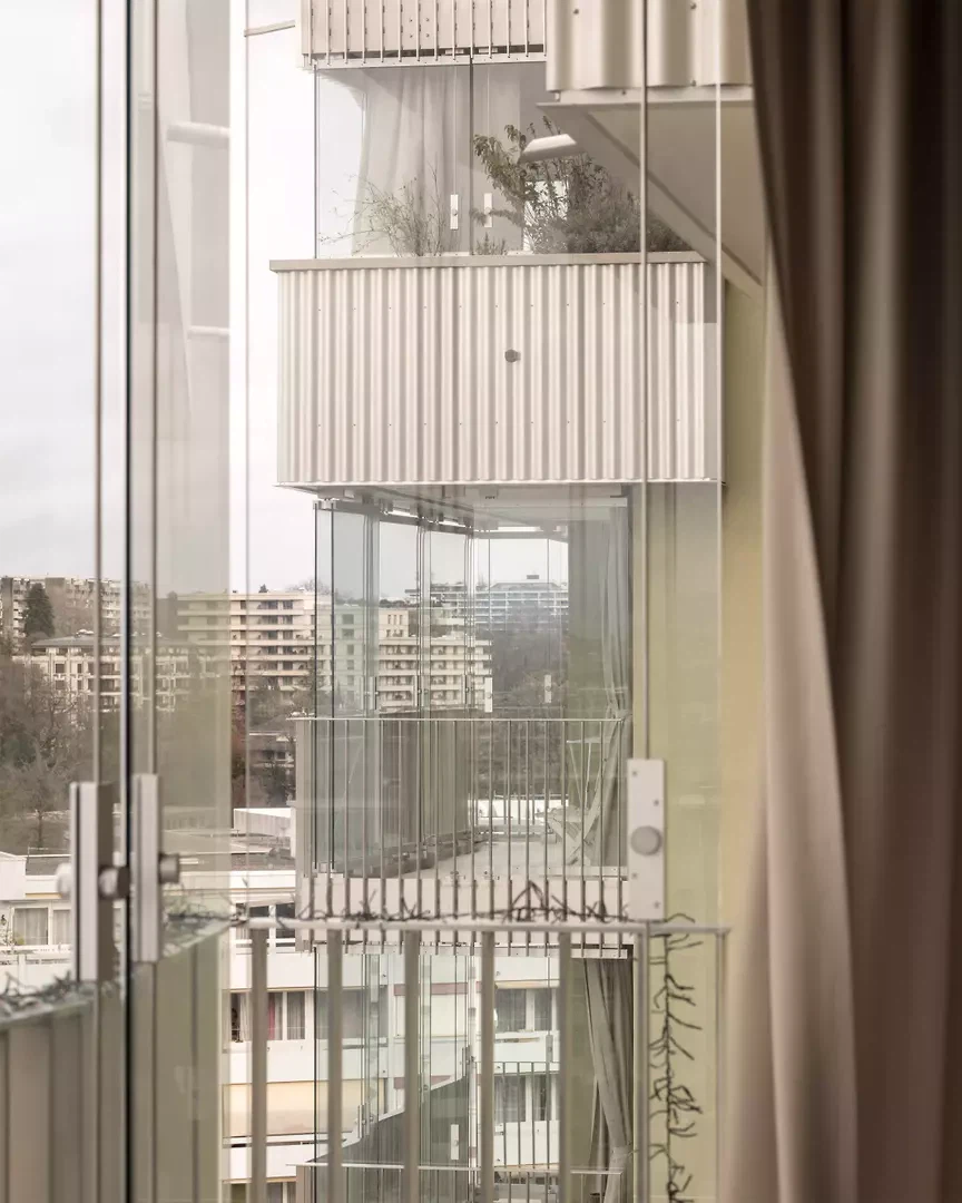 NOMOS trace l’origine de cette idée dans leur collaboration avec Lacaton & Vassal pour la construction de la tour Opale à Chêne-Bourg, ceinturée de jardins d’hiver. Les architectes genevois travaillaient à adapter ce dispositif climatique aux normes suisses, un défi compte tenu sa quasi-inexistence dans notre pays. Les enseignements tirés servirent à nouveau à Vieusseux: la transformation des balcons en jardin d’hiver atténue le pont de froid et augmente le confort climatique. Les jardins d’hiver présentent par ailleurs plusieurs avantages supplémentaires: leur légèreté impacte peu la forme originale de la tour et ils ne comptent pas dans la surface brute de plancher. Des trois variantes, leurs coûts sont les plus faibles et les nuisances liées à leur installation les moins lourdes pour les résident·e·s. Toutes les fenêtres sont également remplacées par du double vitrage et 20 centimètres d’isolation viennent s’ajouter en façade aux six existants.