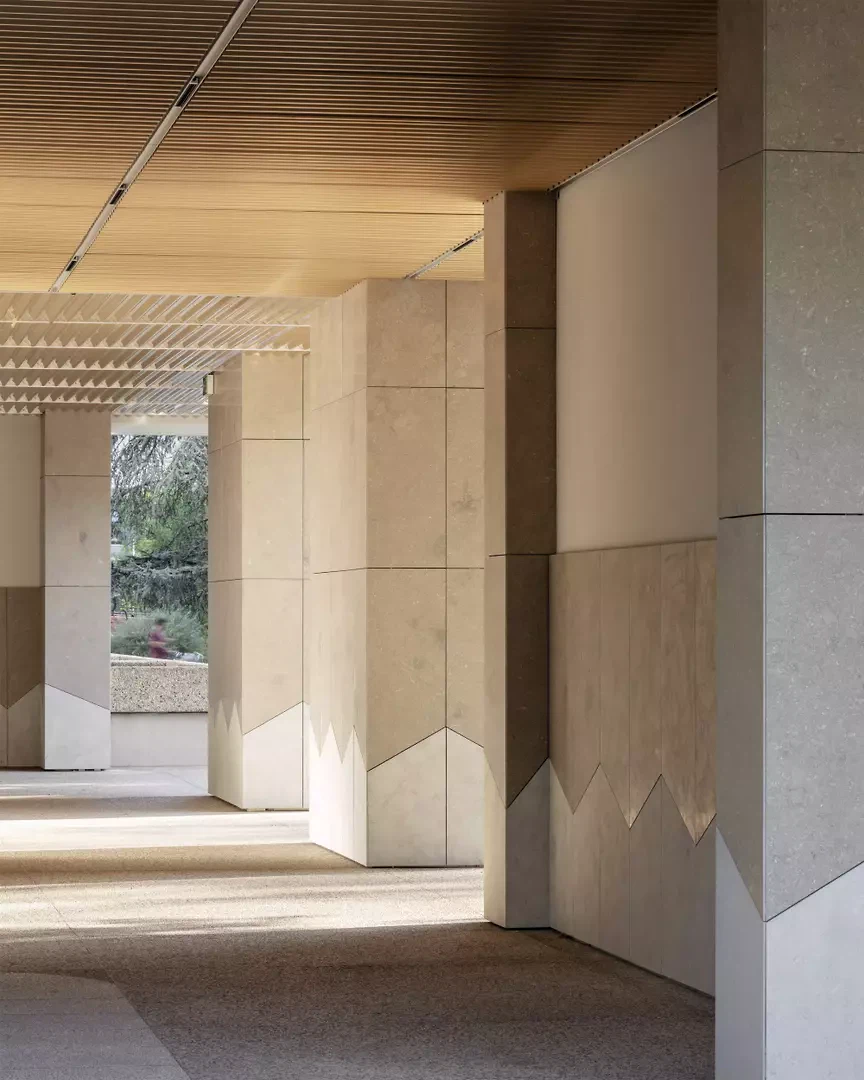 Les teintes beiges des poteaux s’allient avec celle verdâtre des nouveaux revêtements de façade. Le rez-de-chaussée, revêtu  de pierre naturelle locale  aux tonalités beiges, articule un socle ouvert, assurant  la transition entre l’espace public et les usages intérieurs.