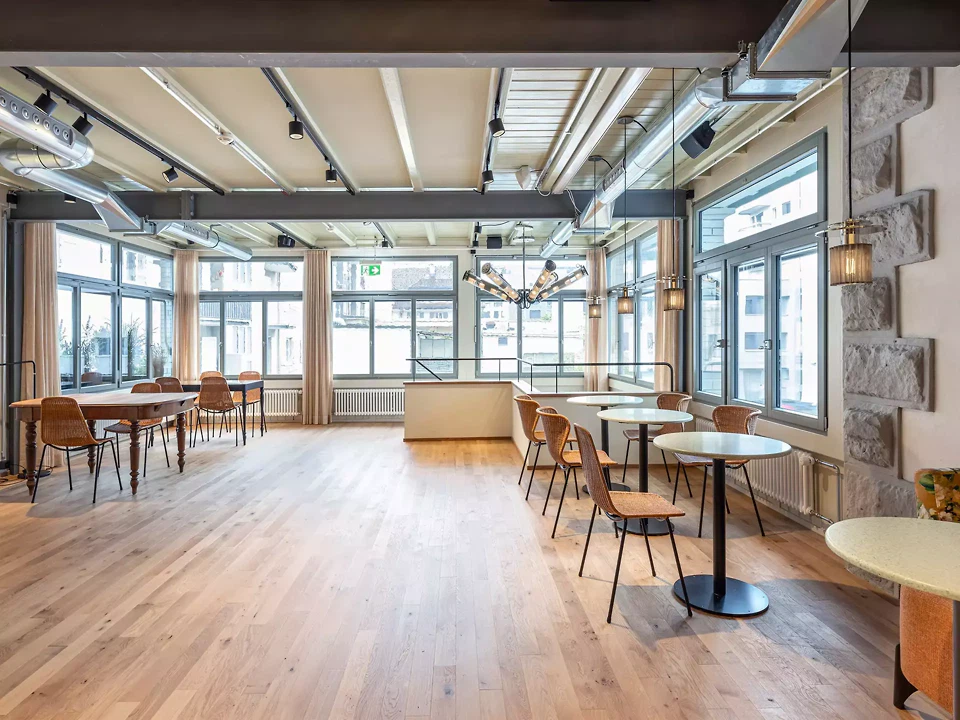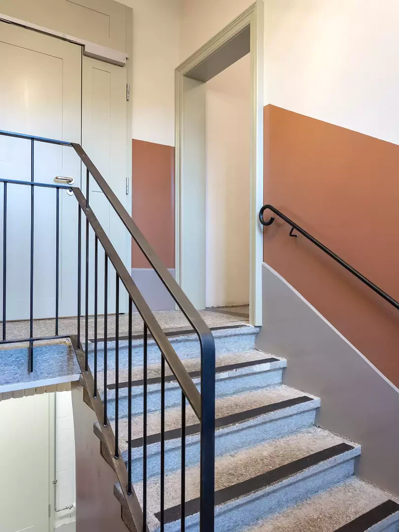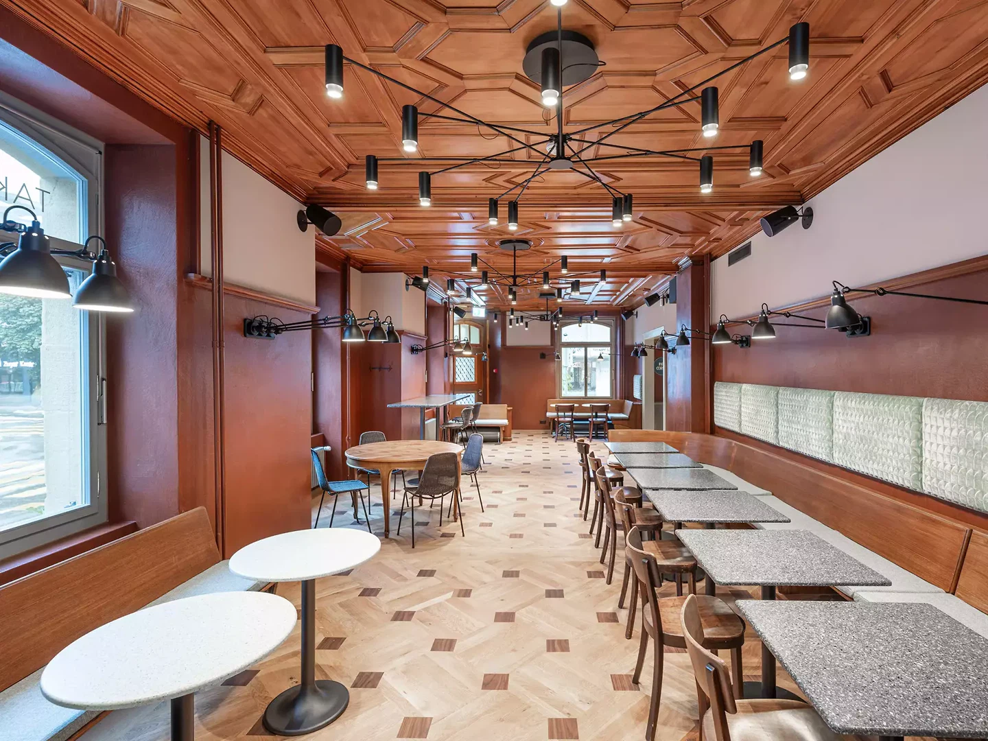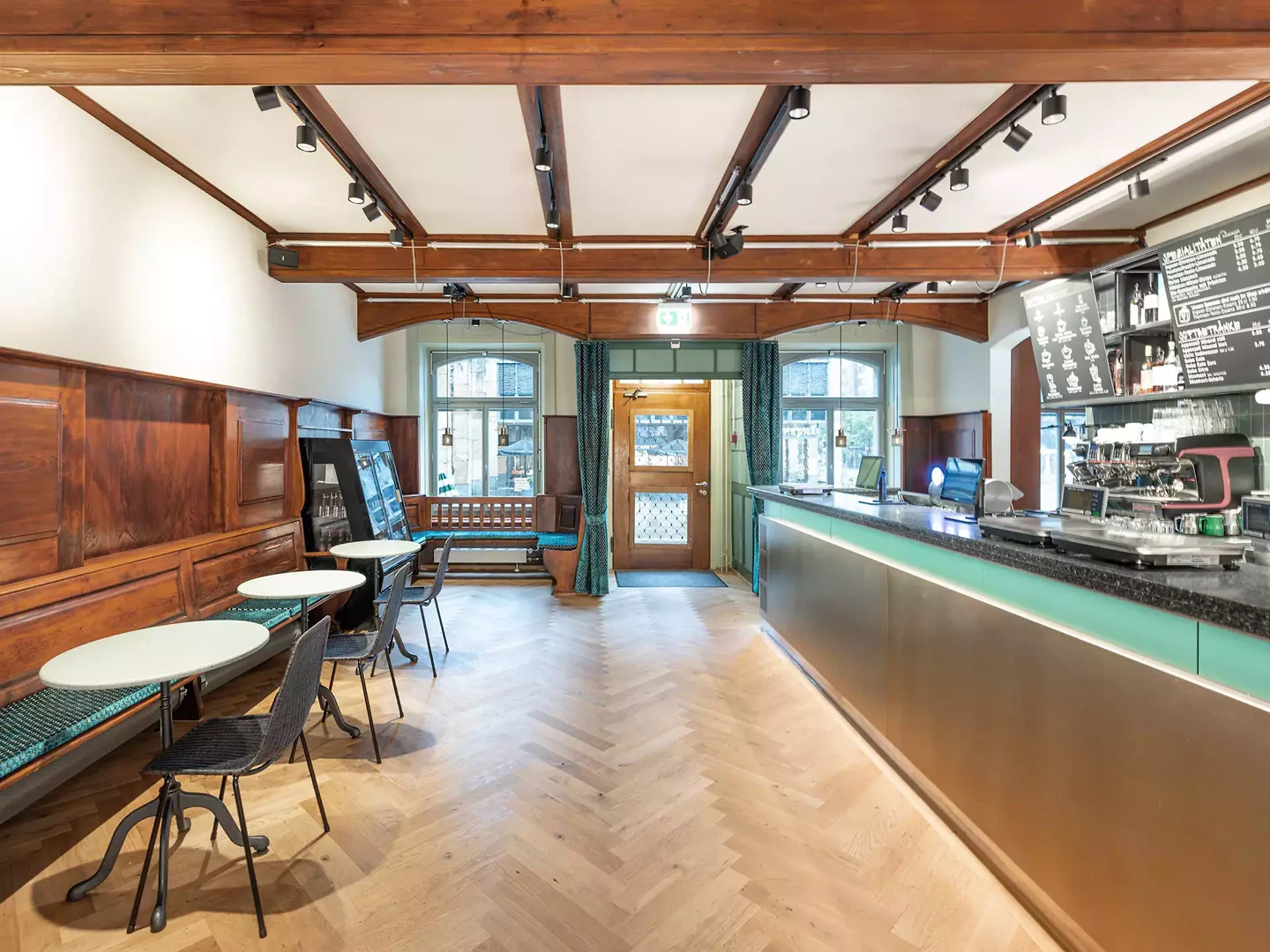 Divers aménagements indésirables datant des dernières décennies ont été démantelés, et les processus opérationnels ont été réorganisés pour s’aligner sur les structures d’origine. Grâce à une intervention précise et minutieuse, les salles de restaurant d’origine, les cages d’escalier ainsi que les façades ont pu être soigneusement réparées, complétées et restaurées conformément aux exigences de la conservation du patrimoine et aux couleurs d’origine, telles qu’elles ont été constatées. Une découverte particulièrement surprenante a été faite dans la petite salle (Sääli) : dans la partie supérieure des murs, sous une couche de peinture facilement lavable, une peinture au pochoir datant de l'époque de la construction a été mise au jour. Le bistrot des ouvriers d'origine, avec ses revêtements muraux et de plafond en bois massif brun foncé, a pu être remis en état et rendu visible après avoir été débarrassé de tout élément perturbateur. Aujourd'hui, le restaurant est exploité en régie dans un cadre moderne, tout en s'inscrivant dans son contexte historique.