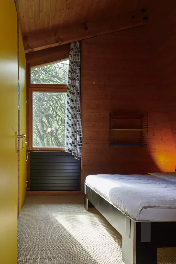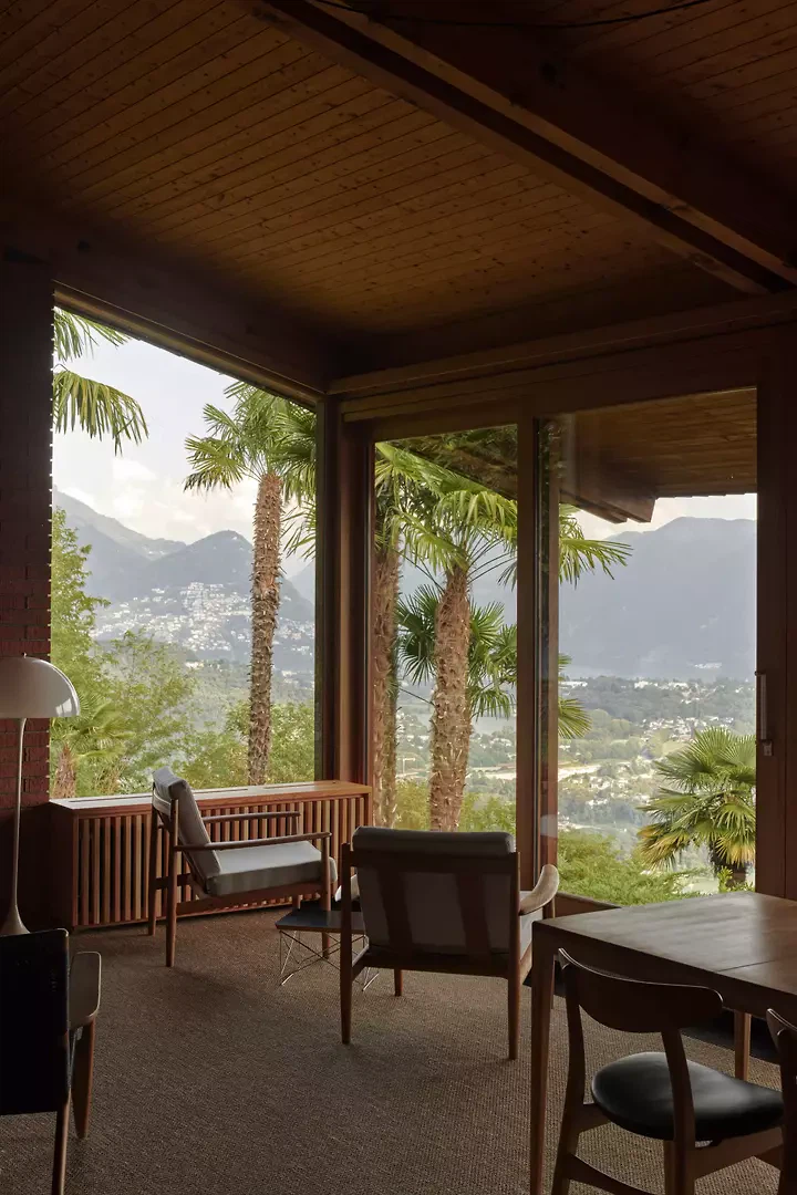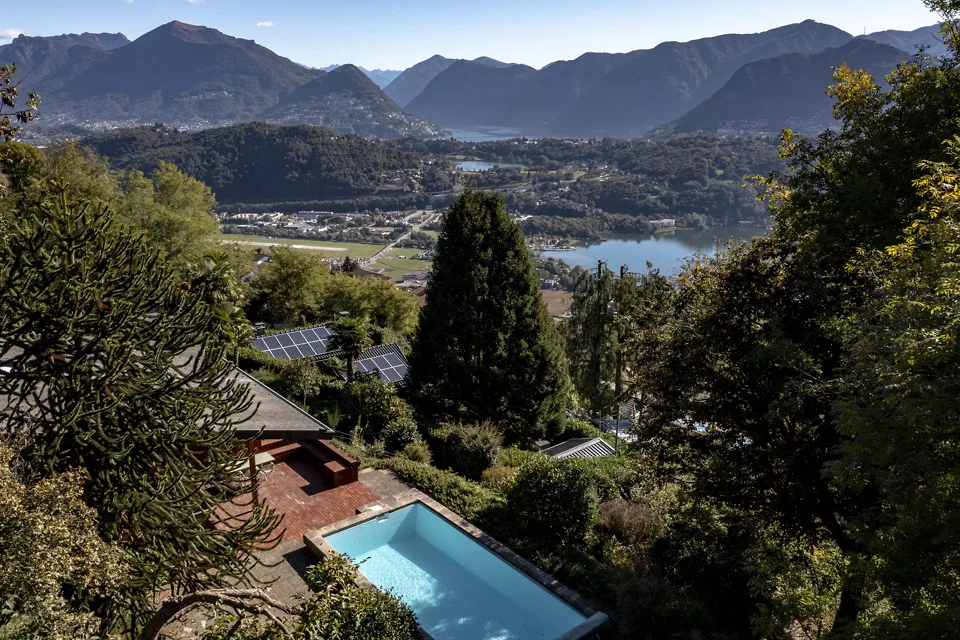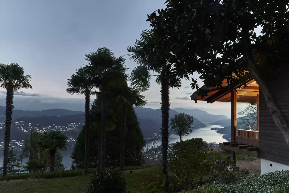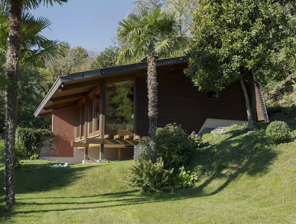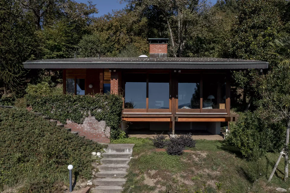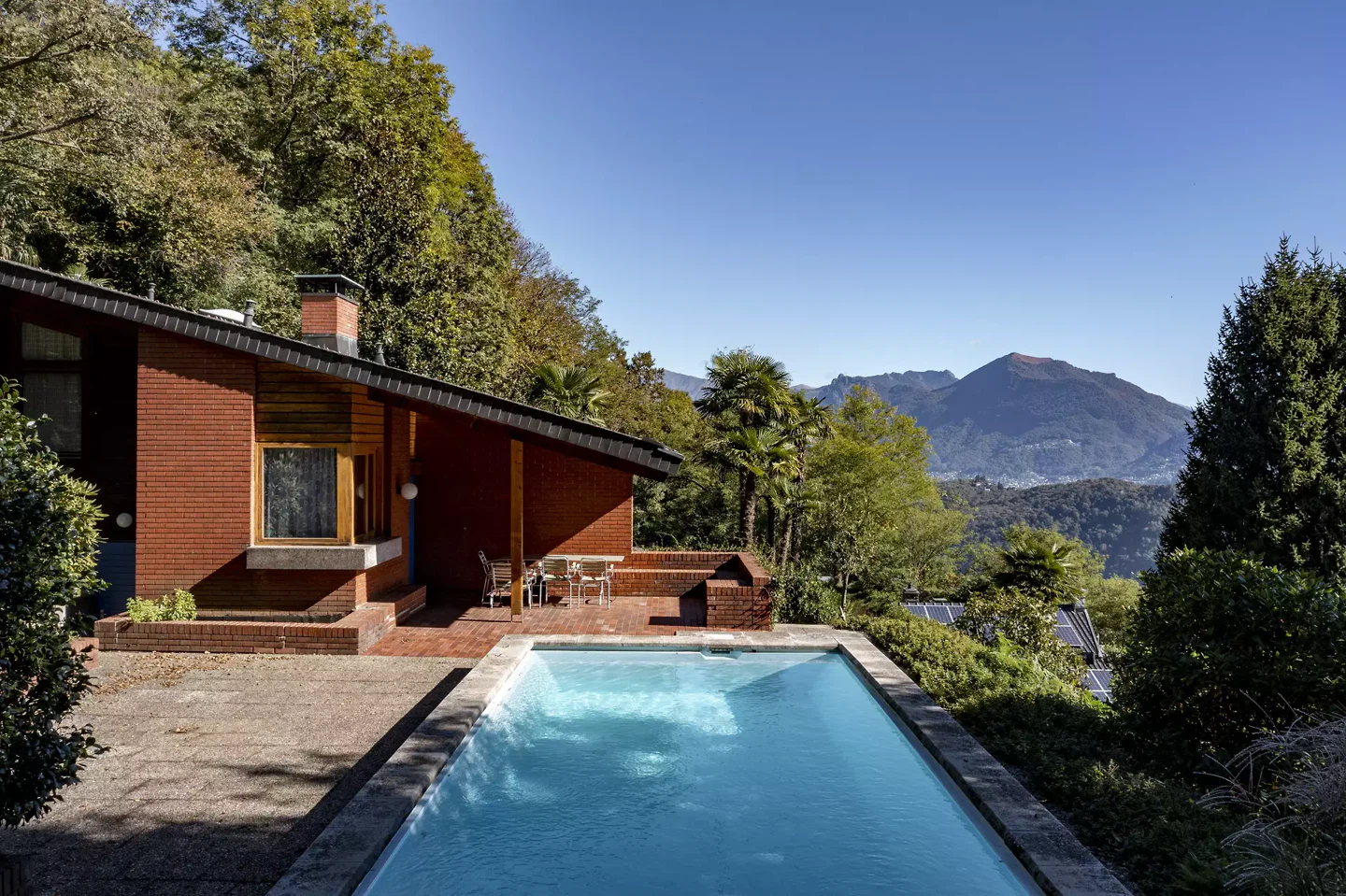 Le bâtiment d'origine a été conçu et construit en 1972 par les architectes Unterlöhner + Waibel, Ulm (Allemagne). Il s'agit d'un bâtiment en briques apparentes avec des murs à ossature bois isolés et recouverts de bois. Le toit asymétrique à deux versants définit les espaces intérieurs de la zone nuit, qui présente des murs inclinés. La façade donnant sur la forêt est entièrement recouverte de tuiles préfabriquées. Le salon dispose de grandes fenêtres et offre une vue imprenable et très pittoresque sur le bras Agno-Porto Ceresio du lac de Lugano.
